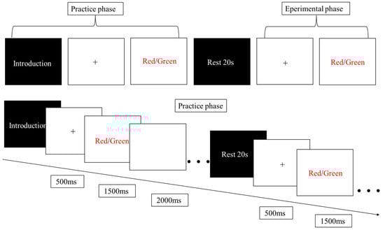 Use E-prime 3.0 (Psychology Software Tools, Pittsburgh, PA, USA) to create a Stroop task stimulus program with 4 blocks of stimuli (2 congruent, 2 incongruent). The stimuli consist of the words “red,” “blue,” “green,” and “yellow,” presented in random order in red, blue, green, and yellow colors. In the congruent condition block, the stimuli are words that match the color they are presented in (e.g., the word “red” in red font); in the incongruent condition block, the stimuli are words that do not match the color they are presented in (e.g., the word “green” in red font). All stimuli are presented in the center of the screen against a black background. Participants are instructed to respond based on the actual color of the Chinese characters, not their meaning, using the “F” key for red (left middle finger), “G” key for blue (left index finger), “H” key for green (right index finger), and “J” key for yellow (right middle finger). Each trial consists of: (1) a 500 ms white fixation cross “+”; (2) a 1500 ms presentation of the Chinese character stimulus; (3) a 2000 ms blank screen interval. Each block includes 15 randomly presented trials, with congruent and incongruent conditions randomly intermixed lasting 60 s. There is a 20 s break between blocks, with 20 s rest periods before and after the experiment. A practice session is included before the actual experiment to ensure participants understand the task requirements. See Figure 1 for a schematic representation of the experimental procedure.