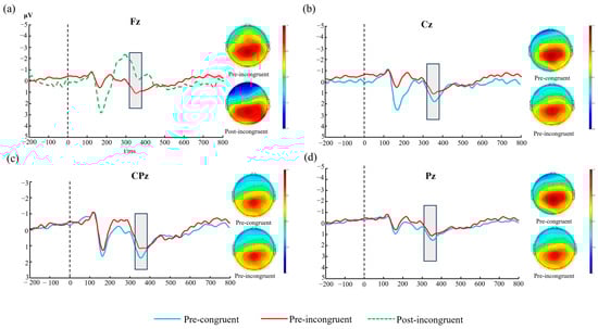 To decompose this three-way interaction, separate two-way repeated-measures ANOVAs (Time × Congruency) were conducted for each of the five electrode sites. At the Fz site, a significant main effect of Time was observed (F(1, 34) = 5.979, p = 0.020, η2 = 0.150). Simple effect analysis further revealed that P3 amplitude significantly decreased after movement under the incongruent condition (p = 0.004; Figure 2a). Neither the main effect of Congruency nor the Time × Congruency interaction reached significance (p > 0.05). At the FCz site, a significant main effect of Congruency was found (F(1, 34) = 5.173, p = 0.029, η2 = 0.132), reflecting significantly reduced P3 amplitudes in the incongruent condition (p < 0.05). The main effect of Time and the Time × Congruency interaction were not significant (p > 0.05).At the Cz site, the main effect of Congruency was significant (F(1, 34) = 5.753, p = 0.022, η2 = 0.145). Simple effect analysis indicated that P3 amplitude was significantly lower in the incongruent condition than in the congruent condition before movement (p = 0.005; Figure 2b). The main effect of Time and the interaction were not significant (p > 0.05).At the CPz site, the main effects of Time and Congruency, as well as their interaction, were not significant (p > 0.05). However, simple effect analysis showed that before movement, P3 amplitude was significantly lower in the incongruent condition compared to the congruent condition (p = 0.024; Figure 2c).At the Pz site, a significant Time × Congruency interaction was identified (F(1, 34) = 4.770, p = 0.036, η2 = 0.123). Subsequent simple effect analysis demonstrated that after movement, P3 amplitude was significantly lower in the incongruent condition relative to the congruent condition (p = 0.021; Figure 2d).