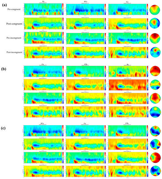 This study utilized Short-Time Fourier Transform to conduct time–frequency analysis on each trial and calculate ERSP. Based on previous research evidence, we focused on the neural oscillatory characteristics in the theta (4~7 Hz), alpha (8~13 Hz), and beta (14~20 Hz) frequency bands. The analysis parameters for each frequency band were set as follows: For the theta band analysis, a time window of 200~500 ms was selected, corresponding to the conflict monitoring stage associated with the N2 component [41]. Electrode selection focused on the ACC area (FCz, Cz), and the frontal lobe (Fz) cortex, regions known to be closely related to conflict monitoring function [42,43,44].For the alpha band analysis, a time window of 300~550 ms was set, covering the inhibition control process related to the P3 component [45]. Analysis primarily targeted the midline parietal region (Cz, Pz, CPz), known to reliably reflect alpha rhythm activity associated with inhibition control [46]. In the beta band analysis, we specifically examined the activity of low-frequency beta within the 250~450 ms time window, corresponding to the motor preparation stage [47,48]. Electrode selection focused on the central motor area (FCz, Cz), typical representation sites for neural activity related to motor preparation [49,50].