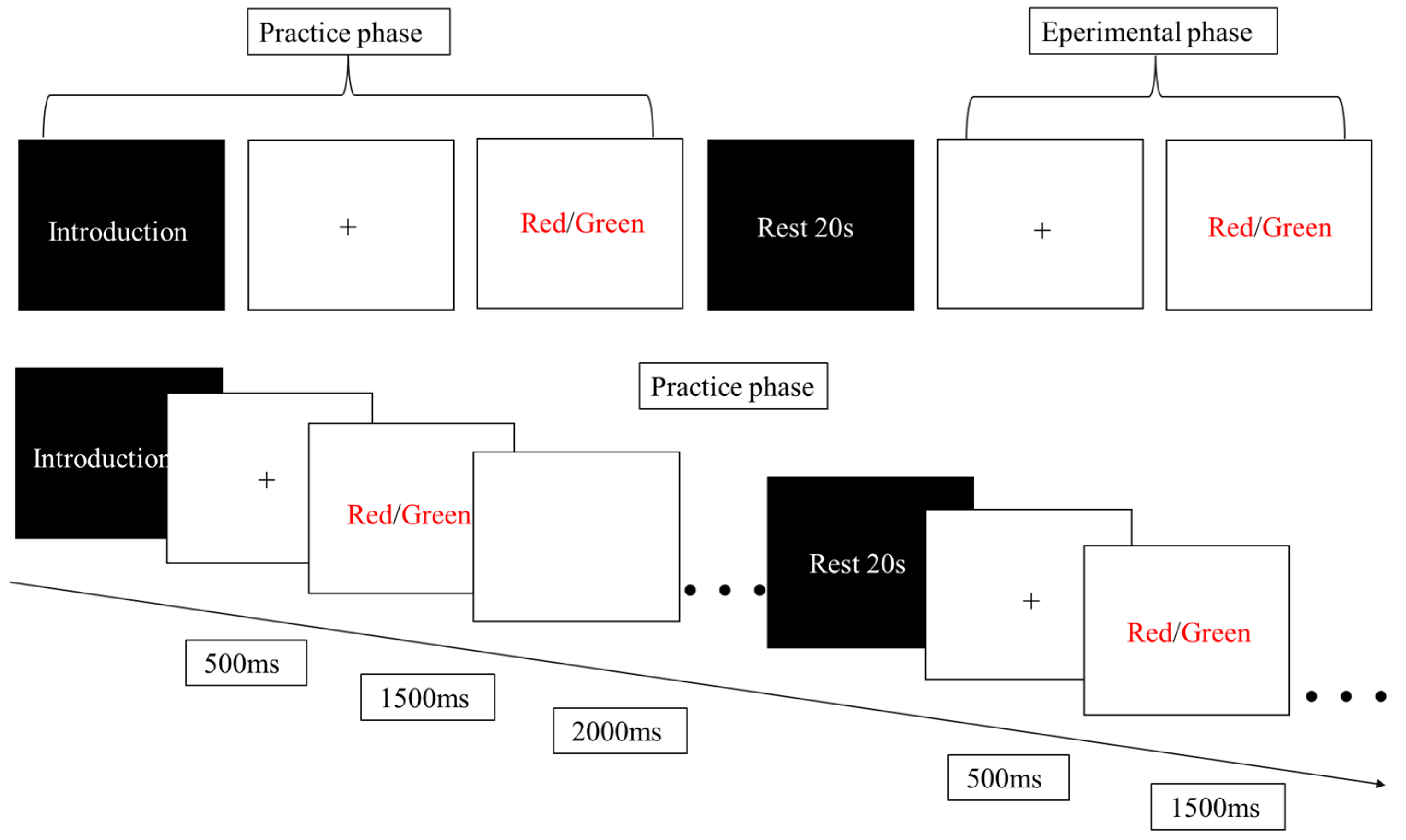 Use E-prime 3.0 (Psychology Software Tools, Pittsburgh, PA, USA) to create a Stroop task stimulus program with 4 blocks of stimuli (2 congruent, 2 incongruent). The stimuli consist of the words “red,” “blue,” “green,” and “yellow,” presented in random order in red, blue, green, and yellow colors. In the congruent condition block, the stimuli are words that match the color they are presented in (e.g., the word “red” in red font); in the incongruent condition block, the stimuli are words that do not match the color they are presented in (e.g., the word “green” in red font). All stimuli are presented in the center of the screen against a black background. Participants are instructed to respond based on the actual color of the Chinese characters, not their meaning, using the “F” key for red (left middle finger), “G” key for blue (left index finger), “H” key for green (right index finger), and “J” key for yellow (right middle finger). Each trial consists of: (1) a 500 ms white fixation cross “+”; (2) a 1500 ms presentation of the Chinese character stimulus; (3) a 2000 ms blank screen interval. Each block includes 15 randomly presented trials, with congruent and incongruent conditions randomly intermixed lasting 60 s. There is a 20 s break between blocks, with 20 s rest periods before and after the experiment. A practice session is included before the actual experiment to ensure participants understand the task requirements. See