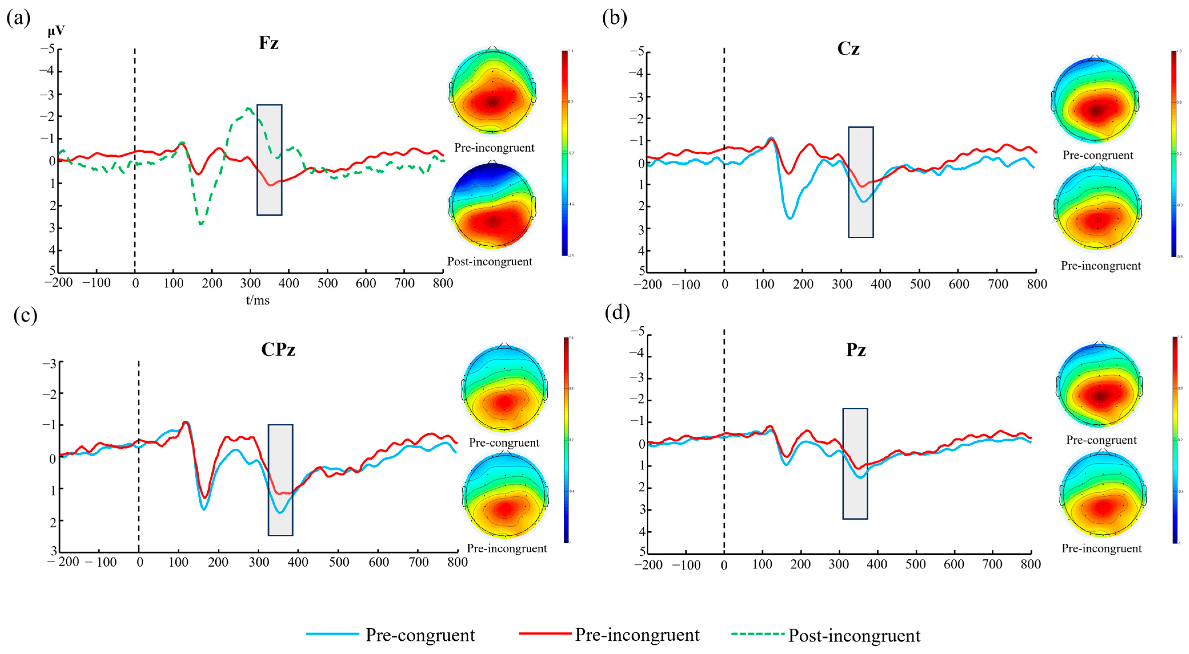 33]); (2) the peak latency (time interval from stimulus presentation to peak). Based on previous research evidence and pilot study results, we focus on the frontal (Fz), fronto-central (FCz), central (Cz), central-parietal (CPz), and parietal (Pz) regions of the brain [