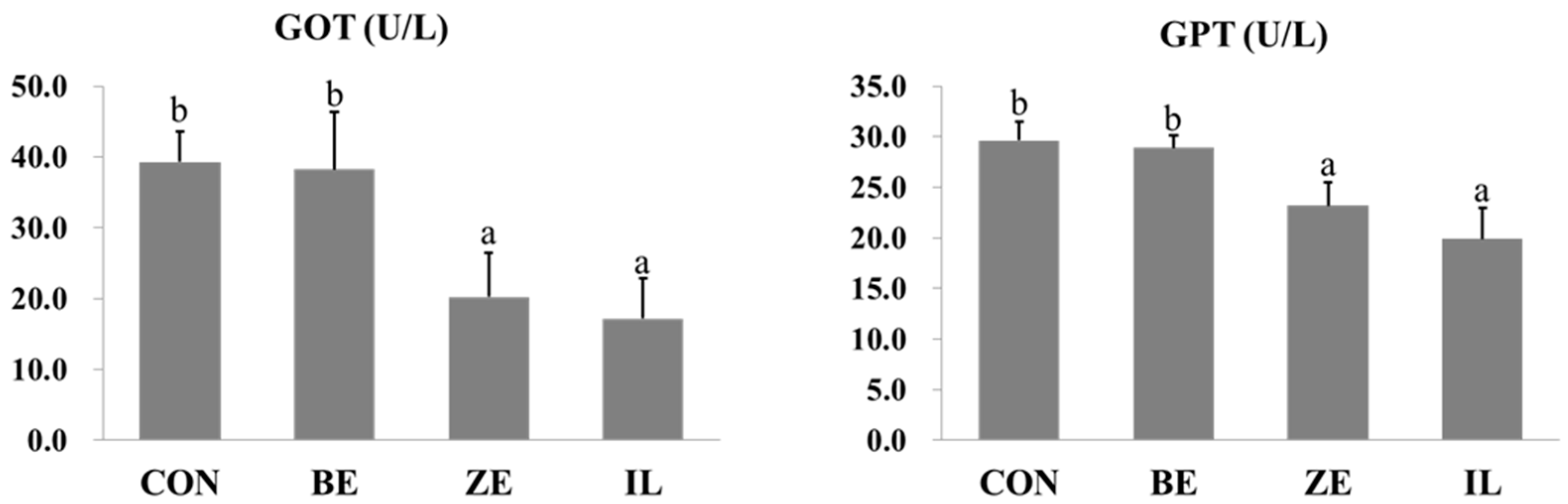 This study aimed to compare the physiological effects of various IL-based dietary supplements, with a particular focus on the influence of IL on the hepatopancreatic function, antioxidant status and immune response in shrimp. The results revealed that shrimp specimens fed the IL-supplemented diet exhibited significantly reduced hemolymph levels of GOT and GPT, both of which are commonly used biomarkers of hepatic stress and cellular injury. The levels of these enzymes are often elevated in aquatic species exposed to dietary toxins or environmental pollutants, suggesting that mineral-based additives may confer hepatoprotective effects under these conditions. Consistent with these findings, Abbas et al. [