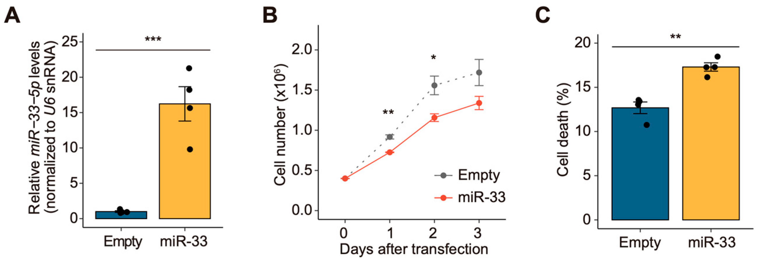 3.1. miR-33 Negatively Regulates Cell Growth in Drosophila S2 Cells