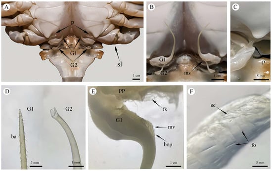 The highly specialized morphology of the male reproductive system is a key taxonomic characteristic for identifying brachyuran species [8]. The morphological variation in the male copulatory apparatus across different species is closely correlated with their mating strategies. In some crab species, an elongated G1 endopod allows direct insertion into the female’s gonopore for spermatophore transfer. However, a columnar G1 endopod does not penetrate directly but instead forms an “abutting” or “coupling” type of copulatory system [9,10,11]. Moreover, the relative length of gonopods is critical for functional determination, where the G2 is considerably longer than the G1 and G2 can directly penetrate female gonopores. Conversely, in species where the G2 is shorter than the G1, sperm delivery to the female’s spermatheca relies on a pumping mechanism facilitated by the G2 [12,13].