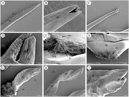 Scanning electron microscopy (SEM) of the male copulatory system of P. trituberculatus. (A) Upper structure of the G1, showing robust lateral barbs and longitudinal suture grooves. (B) Apex of the G1, showing the pinhole-like apical opening. (C) Upper structure of the second gonopod G2, showing the smooth tubular wall. (D) Fish-mouth-shaped apex of the G2, showing blunt teeth on the lower portion and surface folds on the upper portion. (E) Basal opening region of the G1, showing the entrance for the G2 and surrounding plumose setae. (F) Basal morphological structure of the G1 endopod. (G) Lateral view of the penis, showing its external morphology (L: lateral view). (H) Medial view of the penis, showing the ventral setae (R: ventral view). (I) Gonoporal opening of the penis.ba: barb; su: suture groove; ops: opening at the G1 apex; bt: blunt teeth; fo: folds; mv: membranous valve; bop: basal opening of G1; fs: plumose setae; ep: endopod; se: seta; po: penile opening.