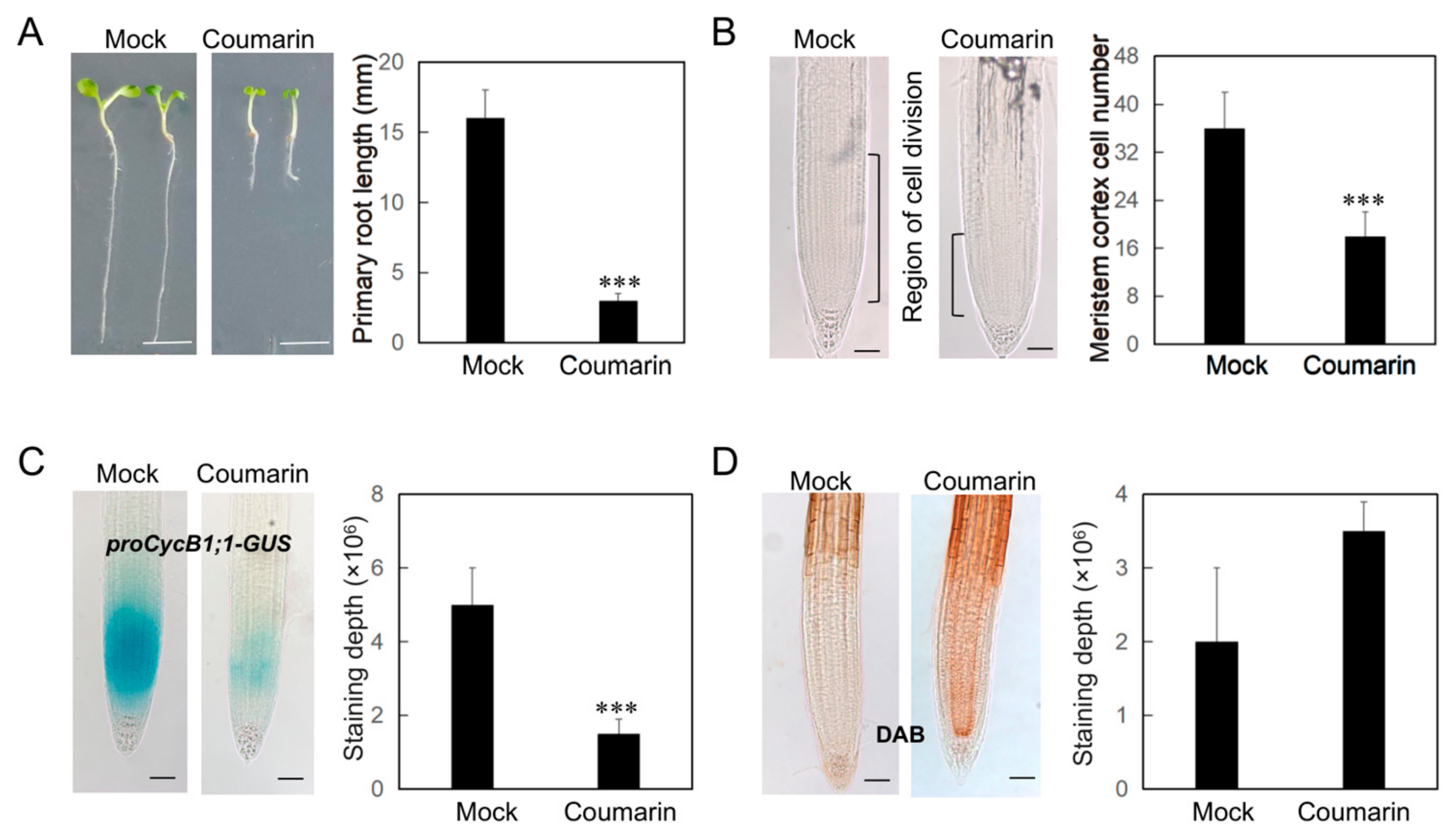- Liu, S.; Ma, A.; Li, J.; Du, Z.; Zhu, L.; Feng, G. Coumarin Promotes Hypocotyl Elongation by Increasing the Synthesis of Brassinosteroids in Plants. Int. J. Mol. Sci. 2025, 26, 1092. [Google Scholar] [CrossRef] [PubMed]