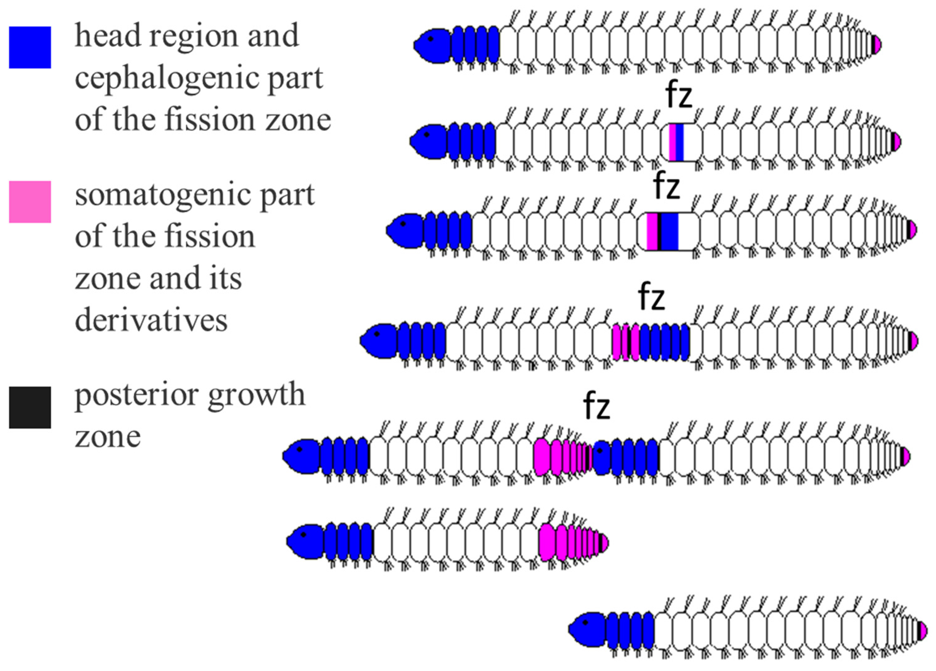 - Kharin, A.V.; Zagainova, I.V.; Kostyuchenko, R.P. Formation of the paratomic fission zone in freshwater oligochaetes. Russ. J. Dev. Biol. 2006, 37, 354–365. [Google Scholar] [CrossRef]