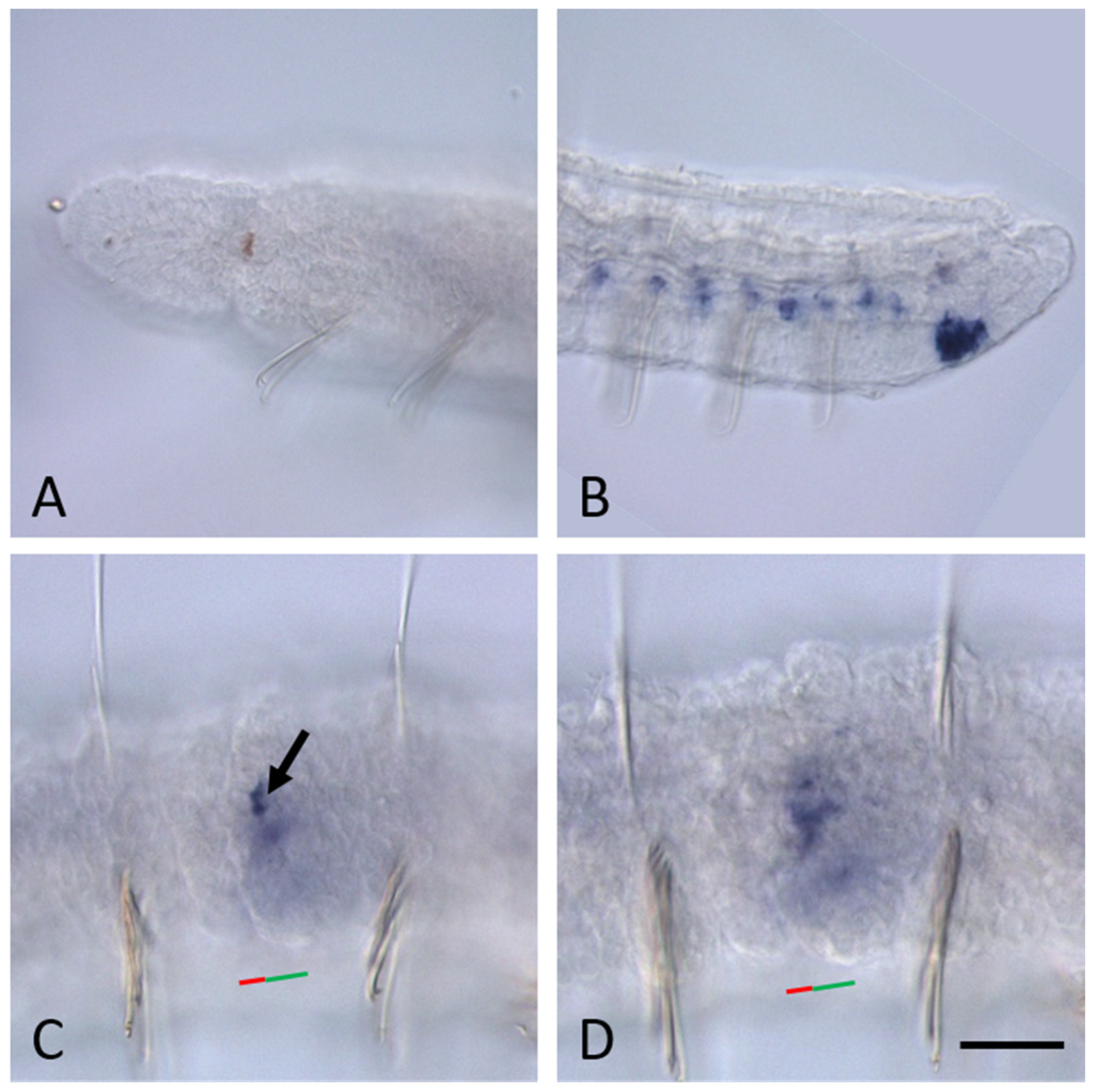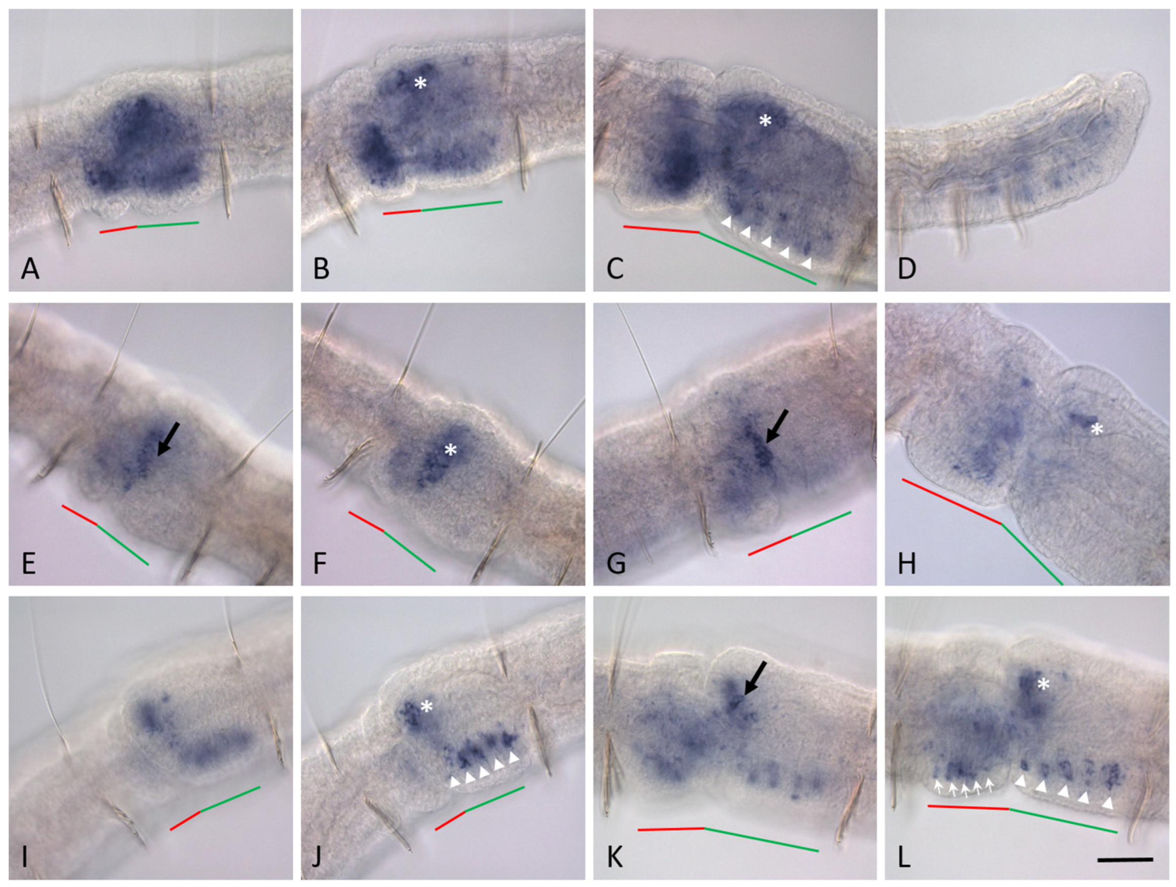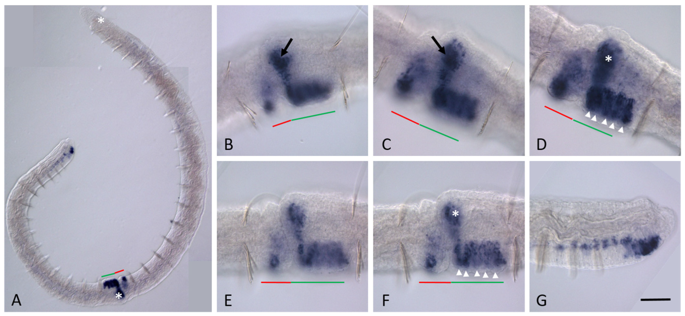 - Planques, A.; Malem, J.; Parapar, J.; Vervoort, M.; Gazave, E. Morphological, Cellular and Molecular Characterization of Posterior Regeneration in the Marine Annelid Platynereis dumerilii. Dev. Biol. 2019, 445, 189–210. [Google Scholar] [CrossRef]