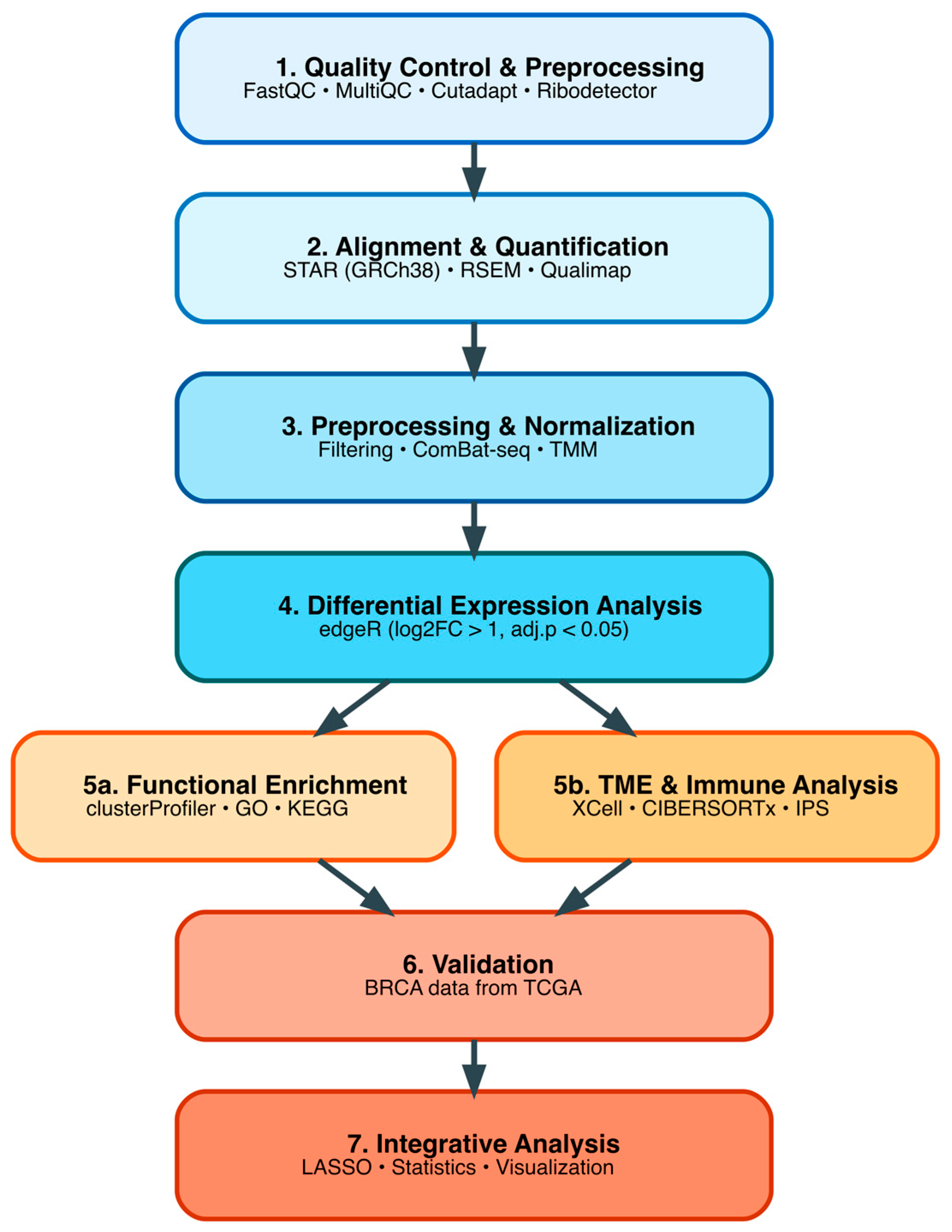 The raw count matrix obtained from RSEM was processed in RStudio (v2023.12.1.402) using Bioconductor to perform differential gene expression analysis by three preprocessing steps. (1) Initially, to control for batch effects across experimental groups, ComBat-seq (from the sva package) was applied to the raw count matrix prior to normalization and differential expression analysis. (2) We performed sample quality control to identify and exclude outliers. Pairwise Pearson correlation coefficients were calculated within each group, and only samples with a mean intra-group correlation ≥ 0.6 were retained, a threshold used to ensure sample concordance in RNA-seq datasets. (3) We performed gene filtering. Genes with extremely high counts (>1 million reads) and those with zero counts across all samples were removed. Genes with very low expression were filtered out by retaining only those with expression values ≥ 10 counts in at least two samples. After these steps, 62 samples (H-TNBC = 20, S-TNBC = 42) and 17,061 genes were retained for downstream analyses. Gene expression data were normalized using the TMM (Trimmed Mean of M-values) method to account for differences in sequencing depth and library composition. Log2-transformed counts per million (CPM), adjusted by the TMM normalization factors, were then used for downstream analyses. Differential gene expression analysis was performed using the edgeR package. Genes were considered significantly differentially expressed if they had log2FC > 1 and an adjusted p-value < 0.05.
