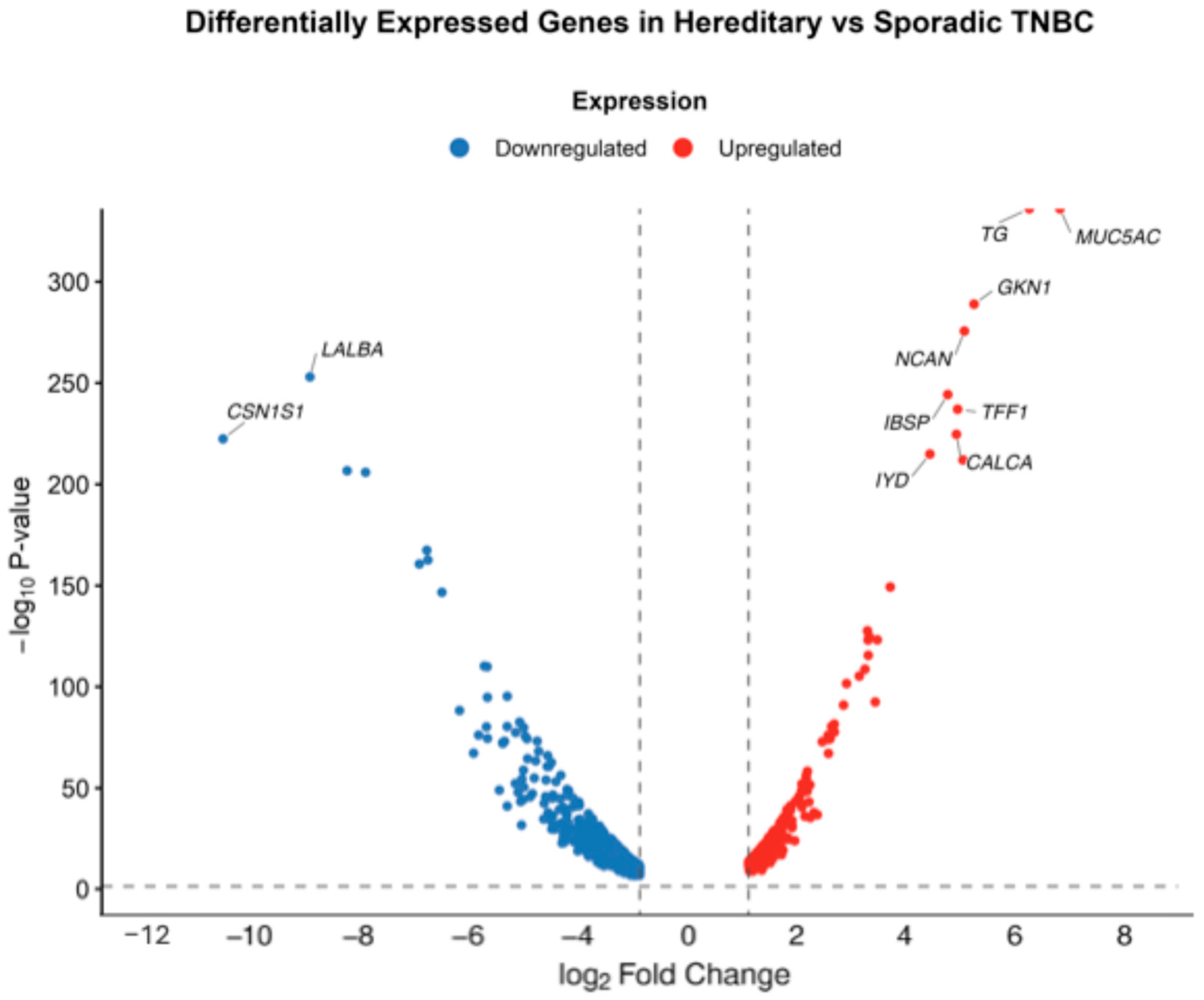 Figure 2. Volcano plot of differentially expressed genes between hereditary and sporadic TNBC cases in the Colombian cohort. Volcano plot displaying 921 DEGs between H-TNBC and S-TNBC. Each point represents a gene. Red dots represent significantly upregulated DEGs, and blue dots indicate significantly downregulated genes. The top significant DEGs are labeled.