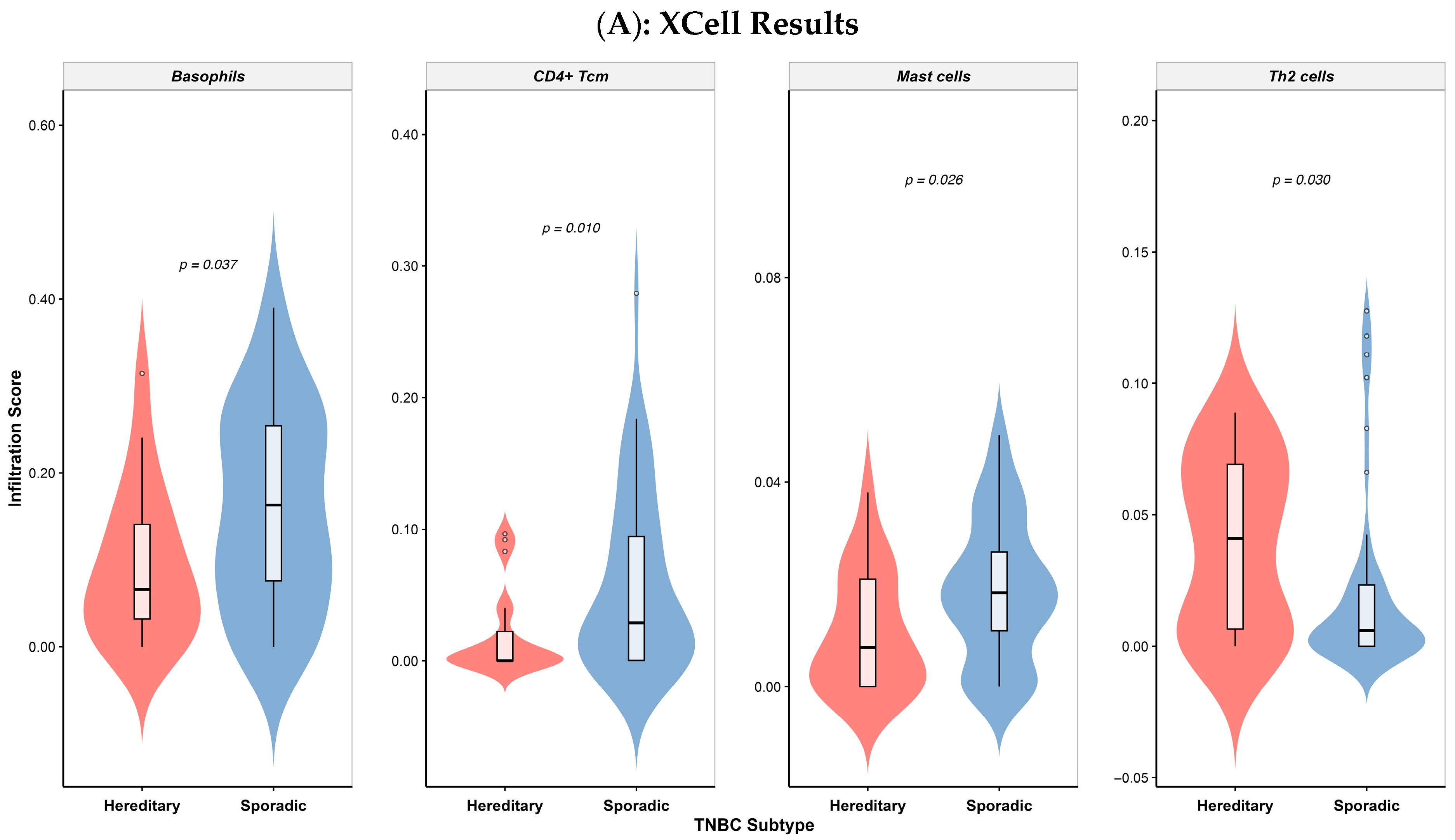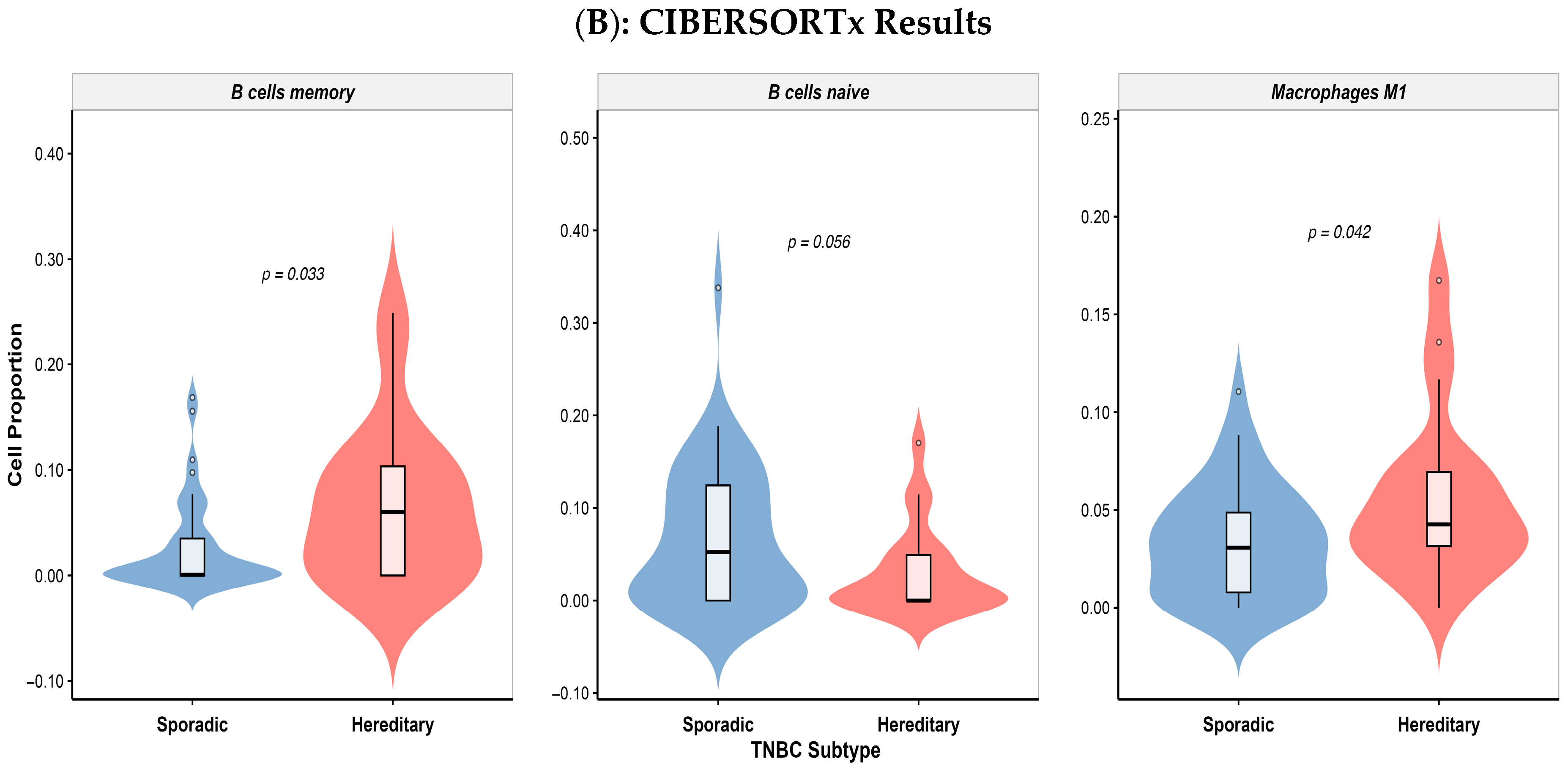 Although only a few molecular distinctions between hereditary and sporadic TNBC have been reported [33,34,35,36], most studies evaluating transcriptomic or molecular differences in BRCA-associated cancers have focused on ovarian cancer or combined cohorts of breast and ovarian tumors [37]. Furthermore, many BC studies do not distinguish between molecular subtypes of BC [24,38], despite growing evidence that each subtype exhibits distinct biological and immunological characteristics. A major challenge lies in the limited representation of admixed populations and the lack of studies integrating molecular and immune profiling to distinguish hereditary from sporadic TNBC. To address these gaps, this study investigated whether hereditary TNBC exhibits distinct molecular and immune features compared to sporadic cases in Colombian women. To this end, we performed a comparative transcriptomic analysis and immune deconvolution. This integrative approach provides novel insights into the biological underpinnings of TNBC heterogeneity, particularly into molecular pathways and differences in TME between hereditary TNBC (H-TNBC) and sporadic TNBC (S-TNBC) in admixed populations.
