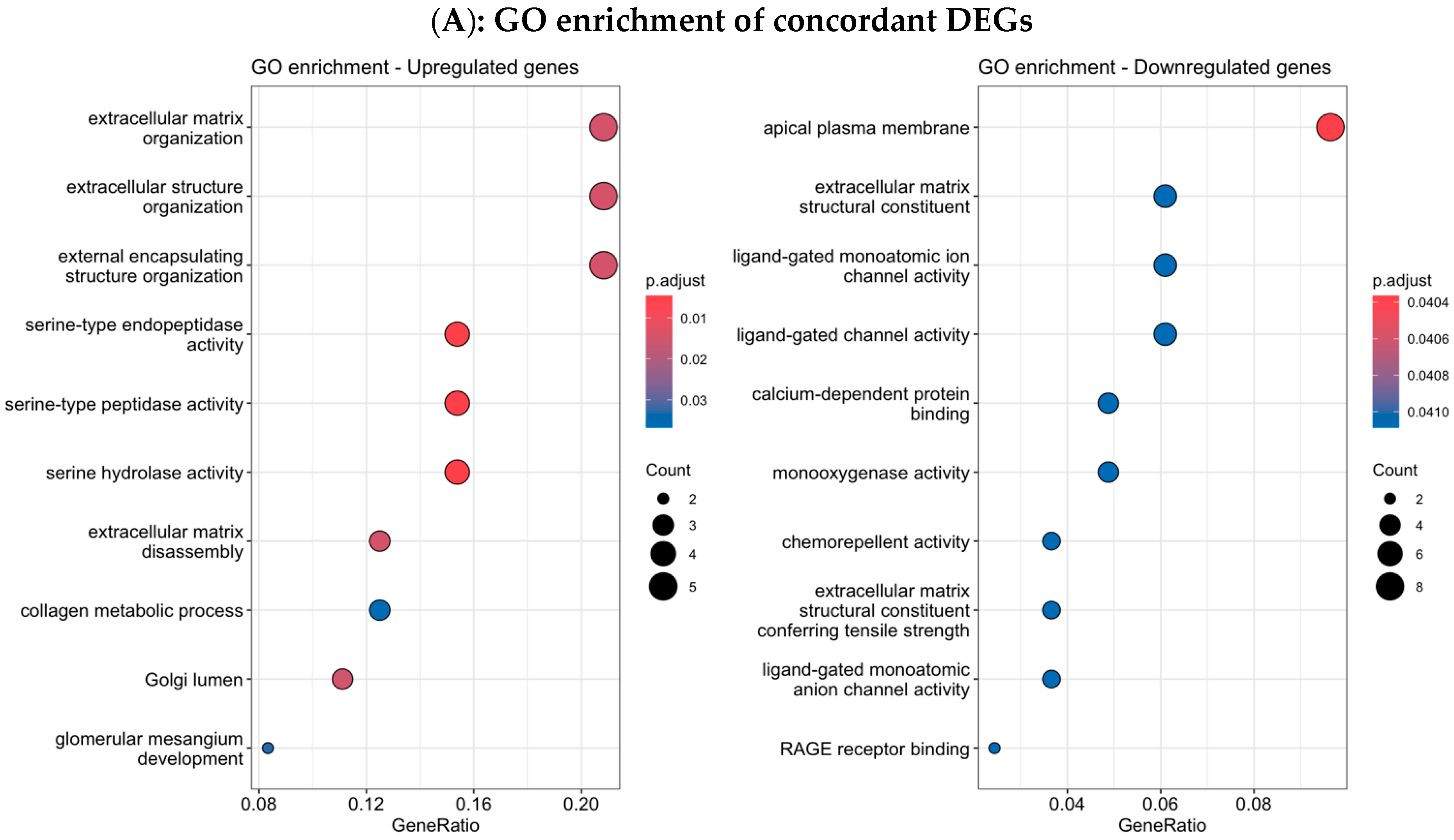 Figure 6. Functional enrichment analysis and KEGG pathways in 113 shared DEGs between cohorts. (A) GO enrichment analysis. (B) KEGG pathways enriched. Each dot represents an enriched category, with size indicating the number of genes and color representing statistical significance.