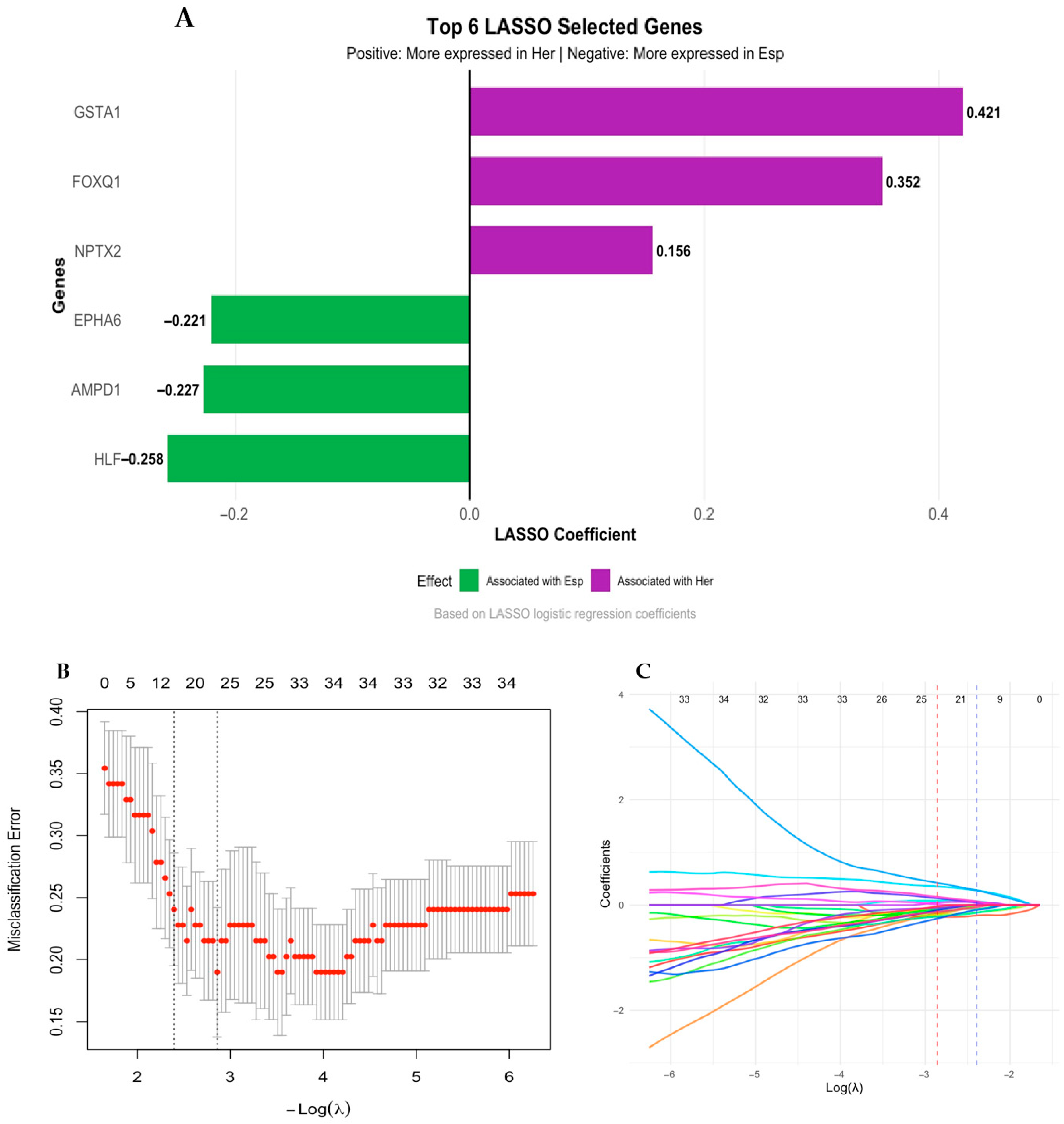 Figure 7. LASSO logistic regression distinguishing hereditary from sporadic TNBC. (A) Bar plot displaying the top six gene coefficients selected by LASSO logistic regression. Positive values represent genes with higher expression in H-TNBC (purple); negative values indicate genes more expressed in S-TNBC (green). (B) Cross-validation plot of the LASSO logistic regression showing the misclassification error rate as a function of the penalty parameter λ. The dotted lines indicate the value of λ with the minimum misclassification error and the value of λ within one standard error of the minimum. The numbers at the top indicate the number of variables selected at each point. (C) Coefficient trajectories as a function of log(λ). Each line represents a predictor, and non-zero values at the optimal λ correspond to the variables selected to discriminate between hereditary and sporadic TNBC.