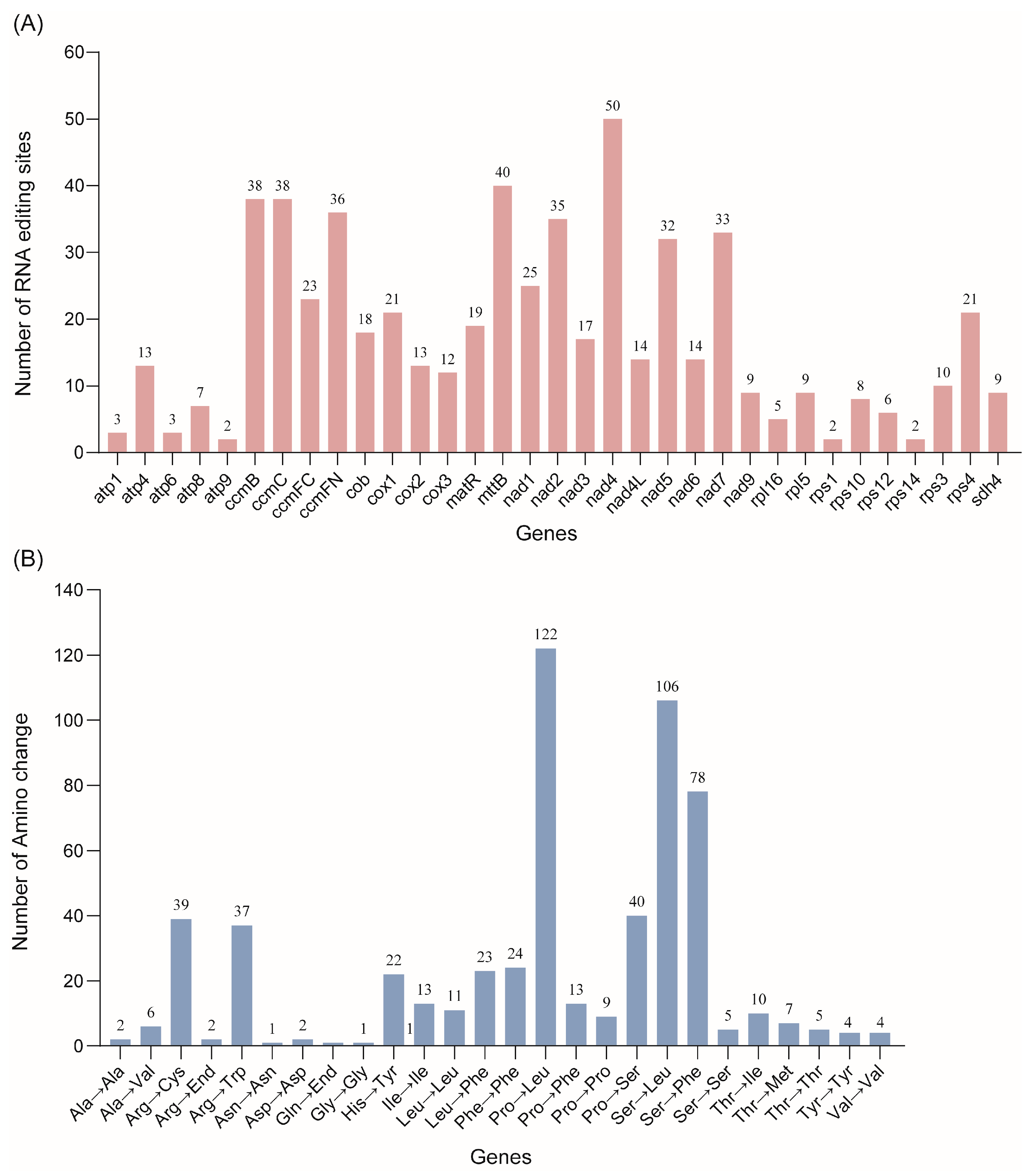 3.5. Characteristics and Distribution of RNA Editing Sites