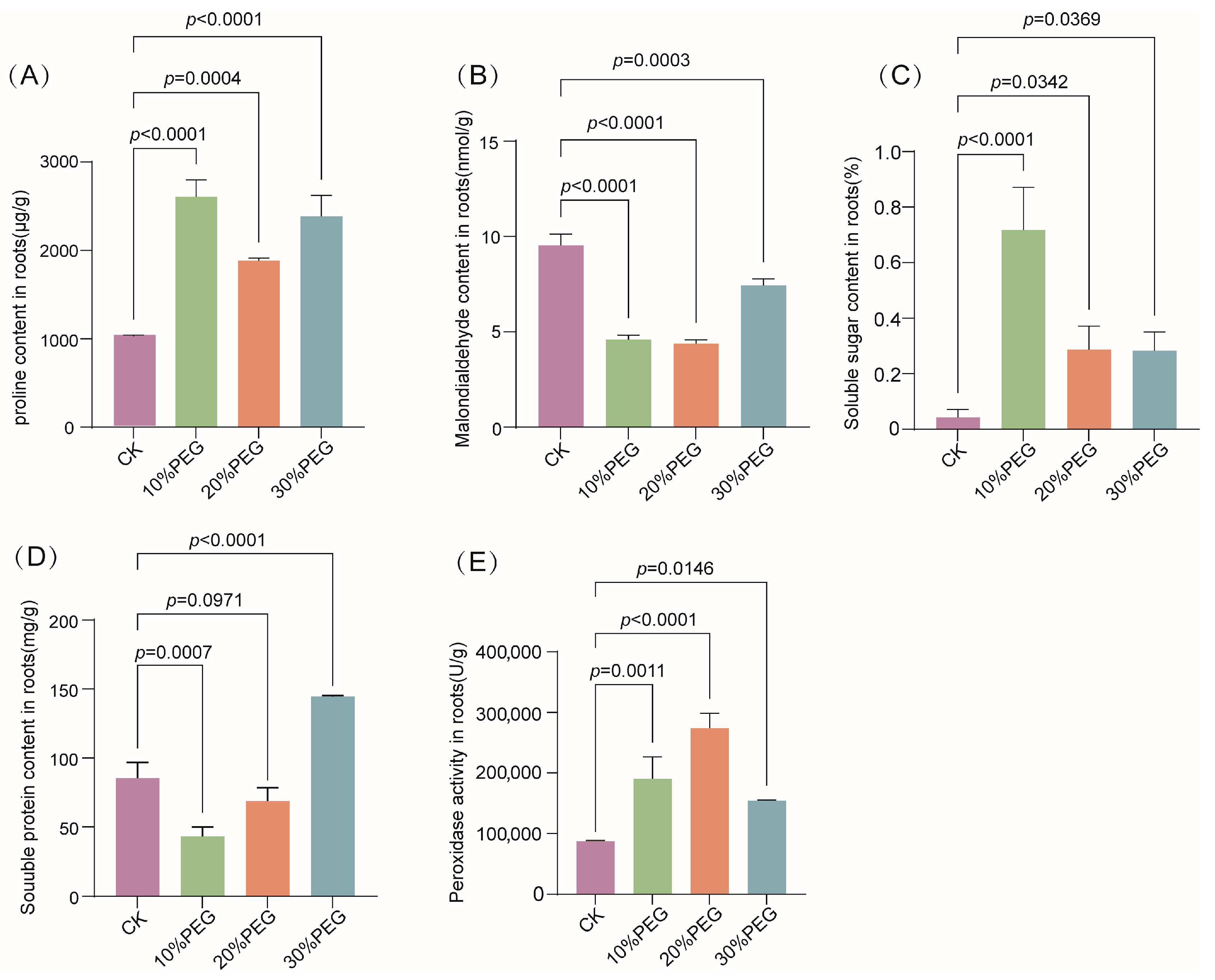 2.8. Measurement of Various Physiological Indices of S. moorcroftiana Seedlings Under Drought Stress