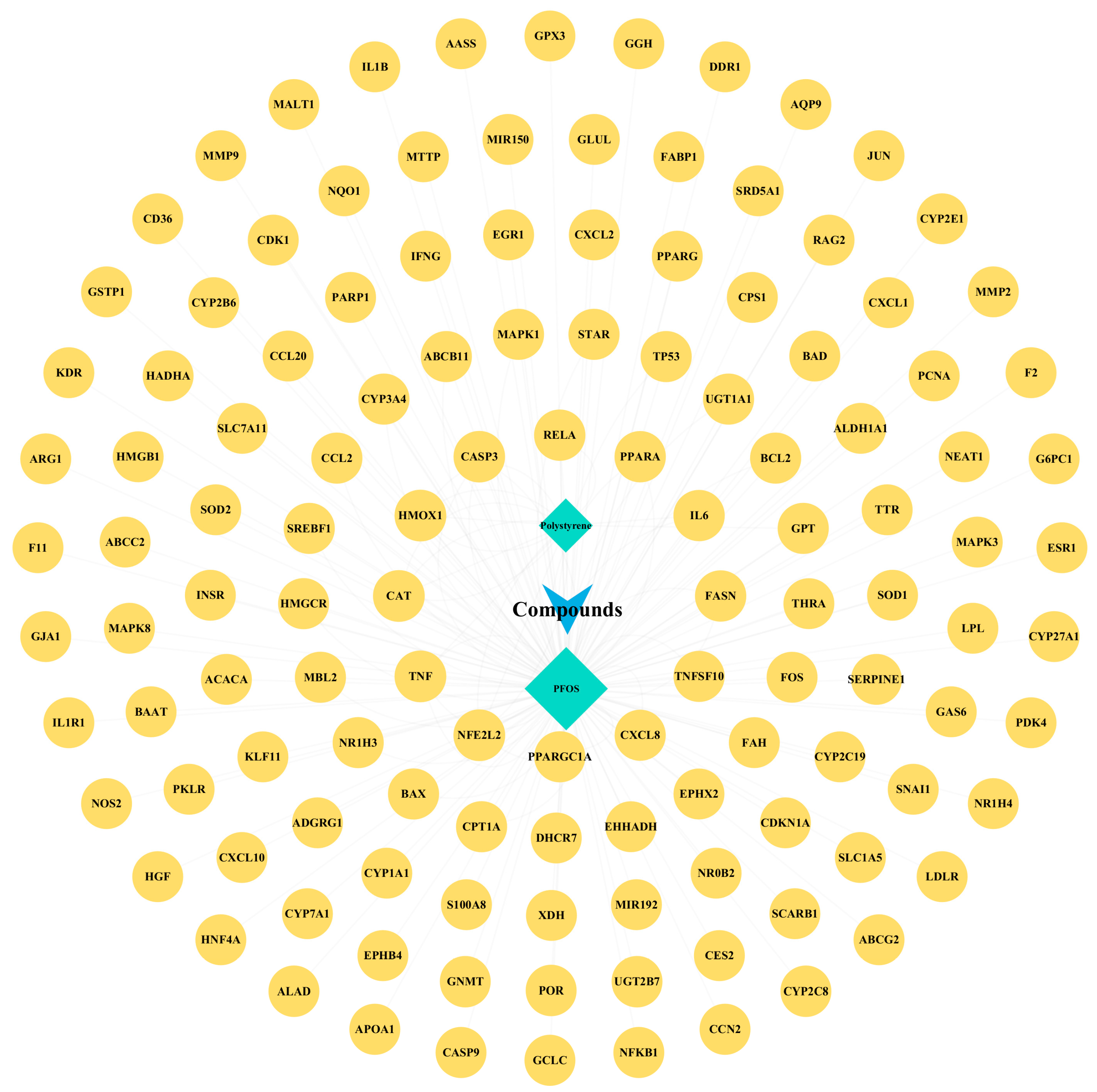 2.5. Acquisition of PFOS/PS and Liver Injury-Related Target Genes