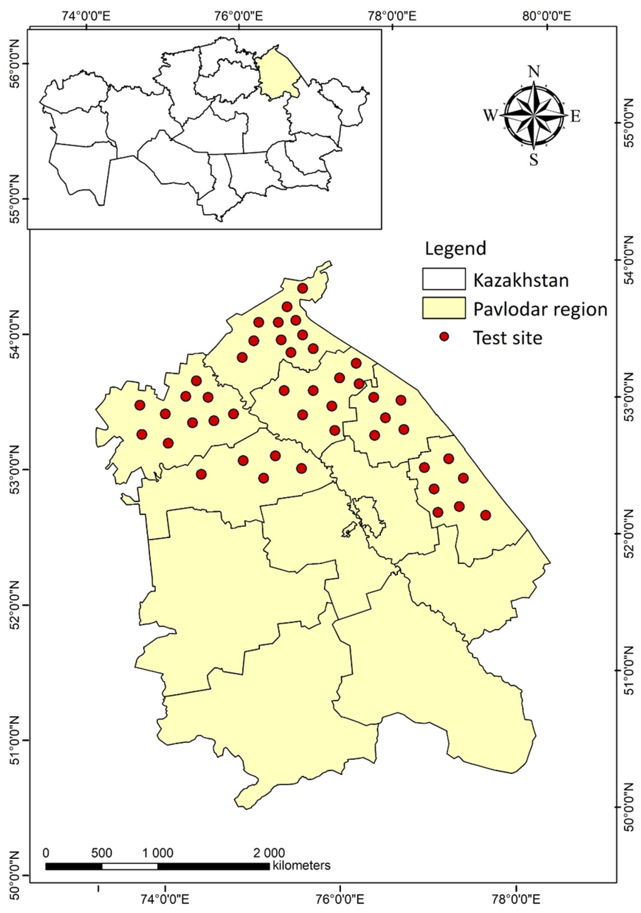 Field studies were conducted in the northeastern part of Kazakhstan, within the Pavlodar region (52.2–52.5° N, 76.8–77.1° E), in areas under spring wheat cultivation. The plots were located in typical steppe agro-landscapes, characterised by flat terrain with slight topographical differentiation.