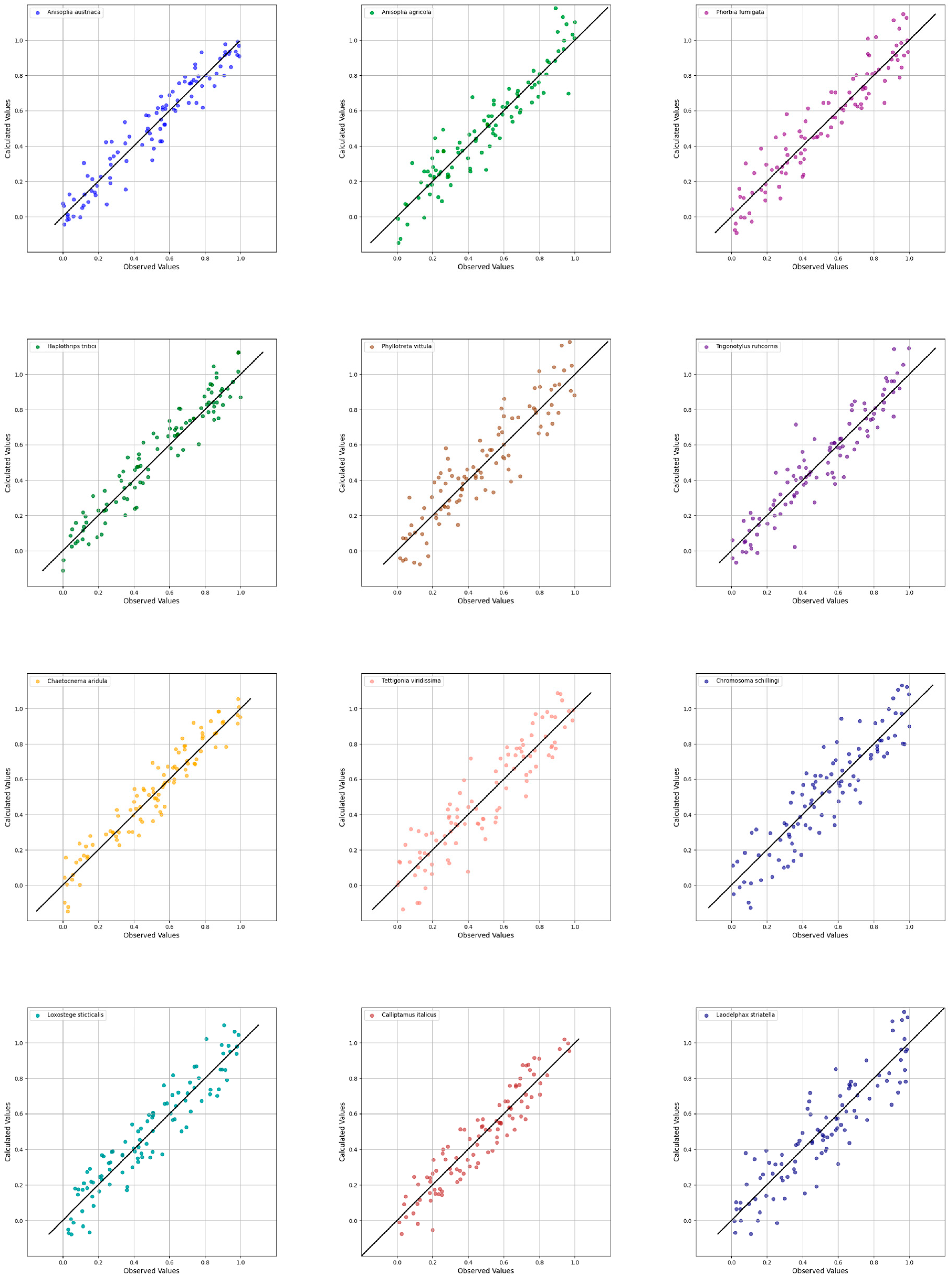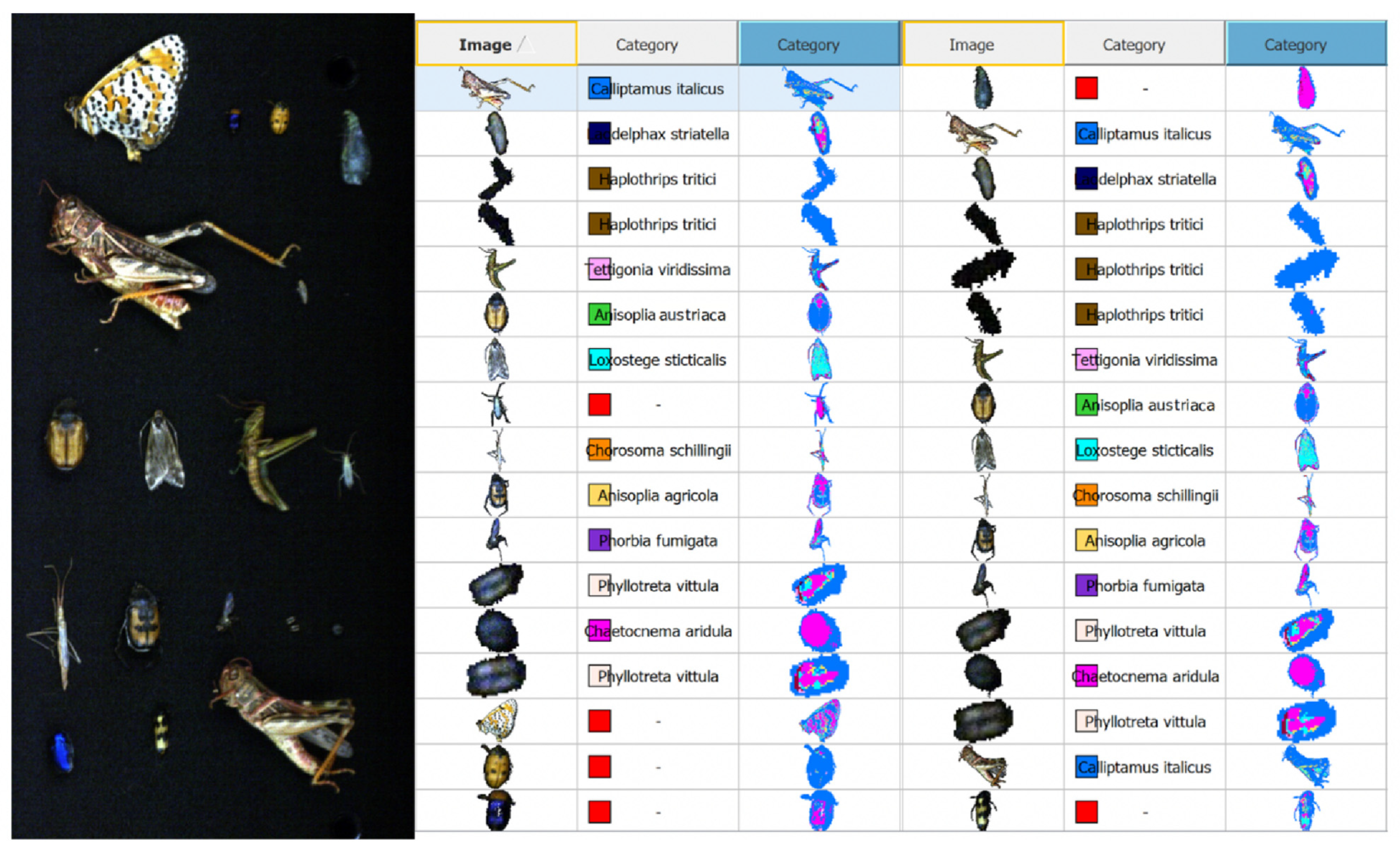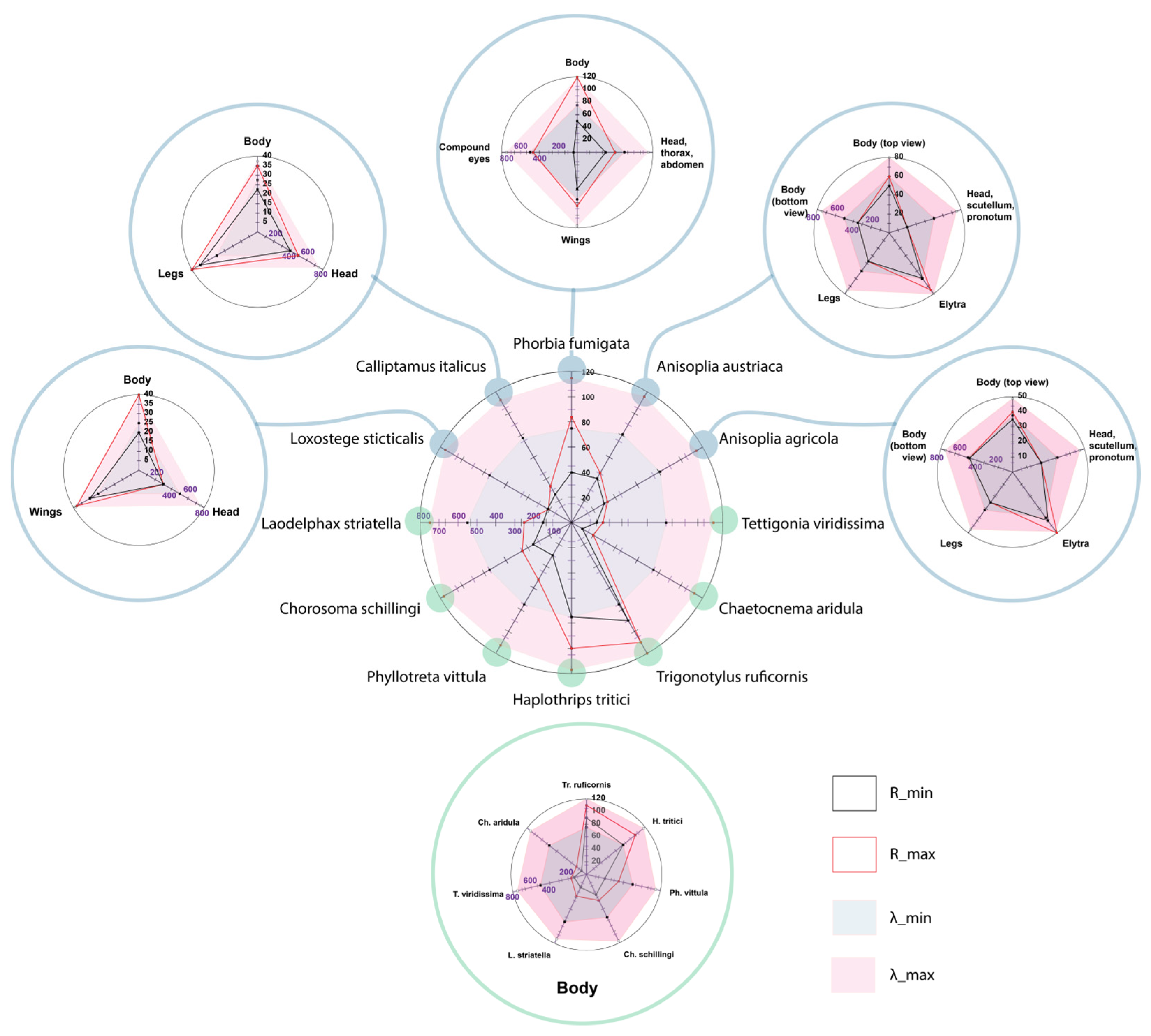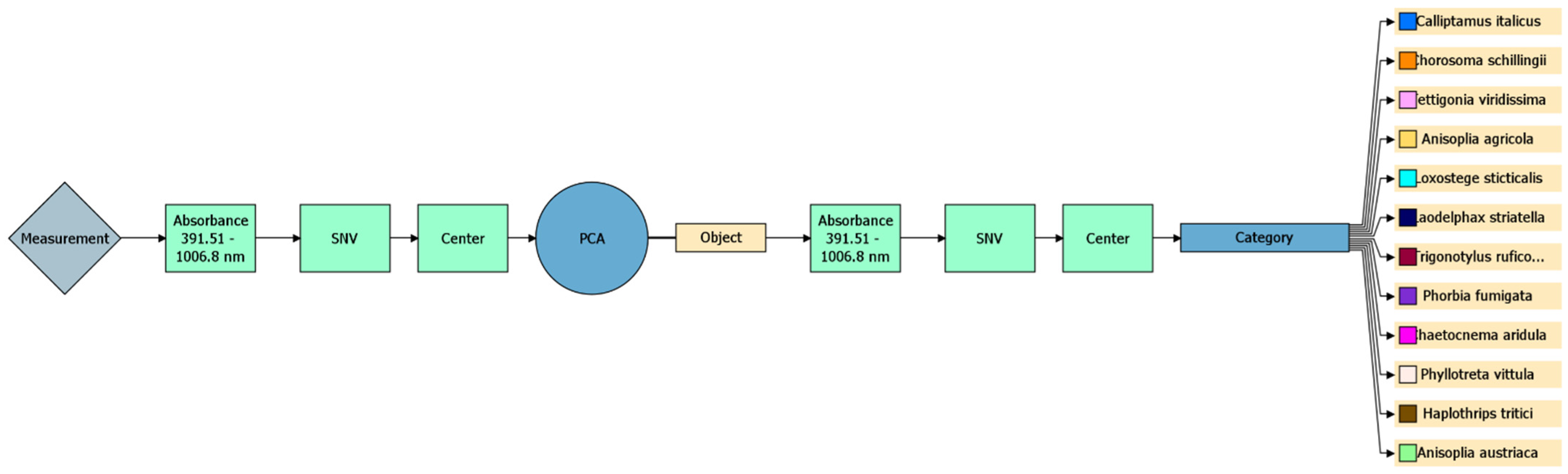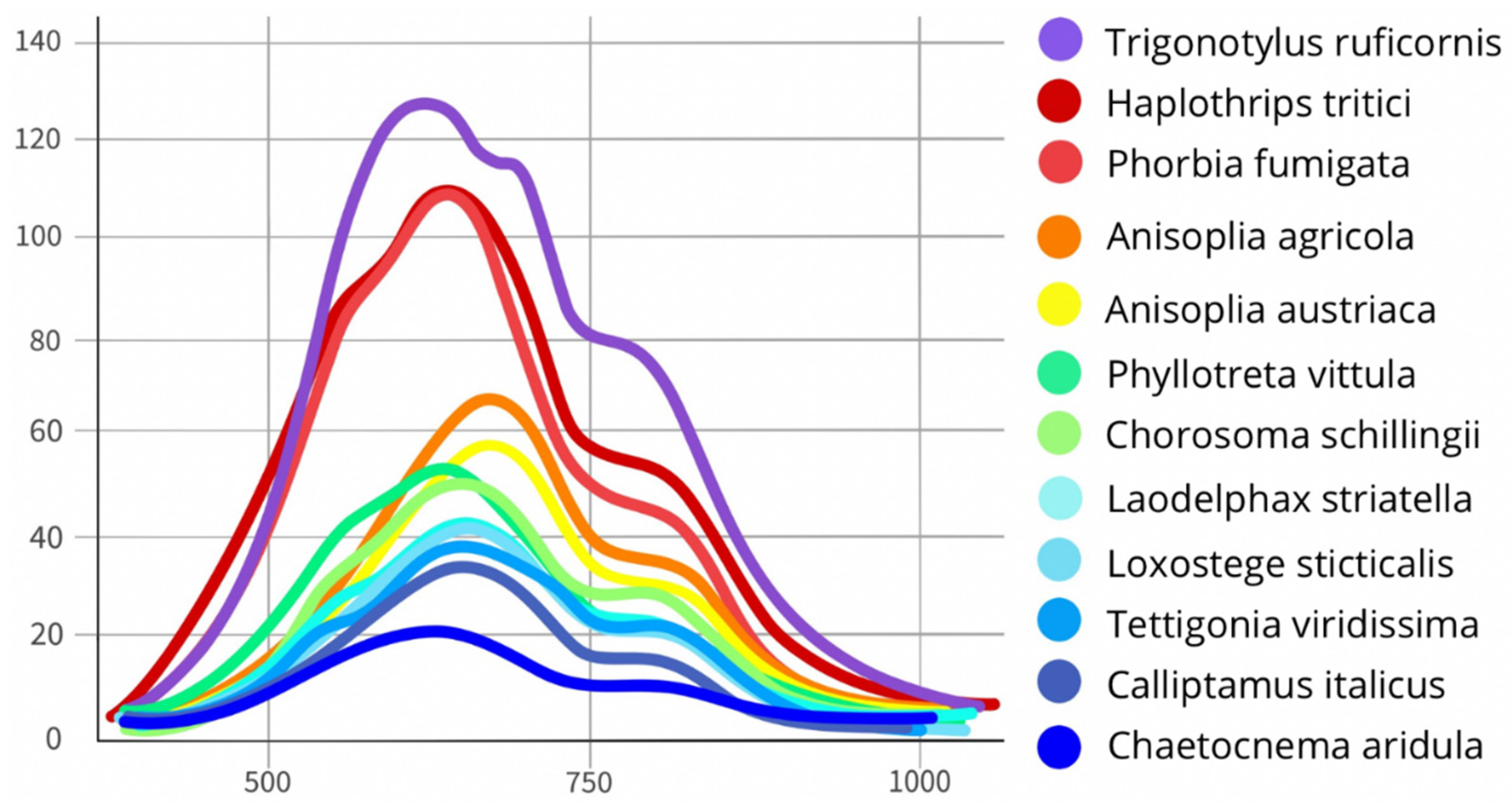 The following insect species were selected as study objects: Anisoplia austriaca, Anisoplia agricola, Phorbia fumigata, Trigonotylus ruficornis, Phyllotreta vittula, Haplothrips tritici, Chorosoma schillingii, Loxostege sticticalis, Tettigonia viridissima, Chaetocnema aridula, Calliptamus italicus, Laodelphax striatella.