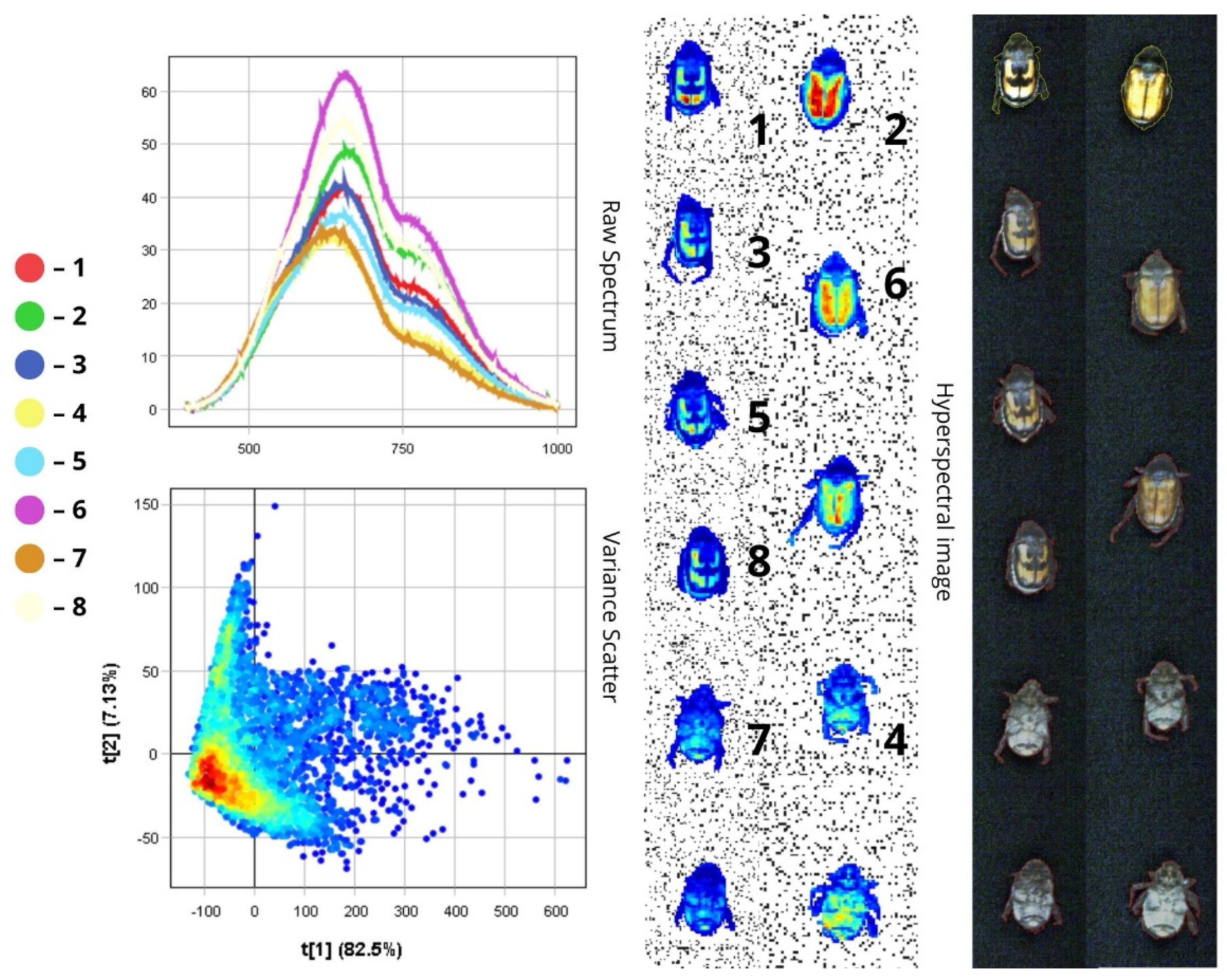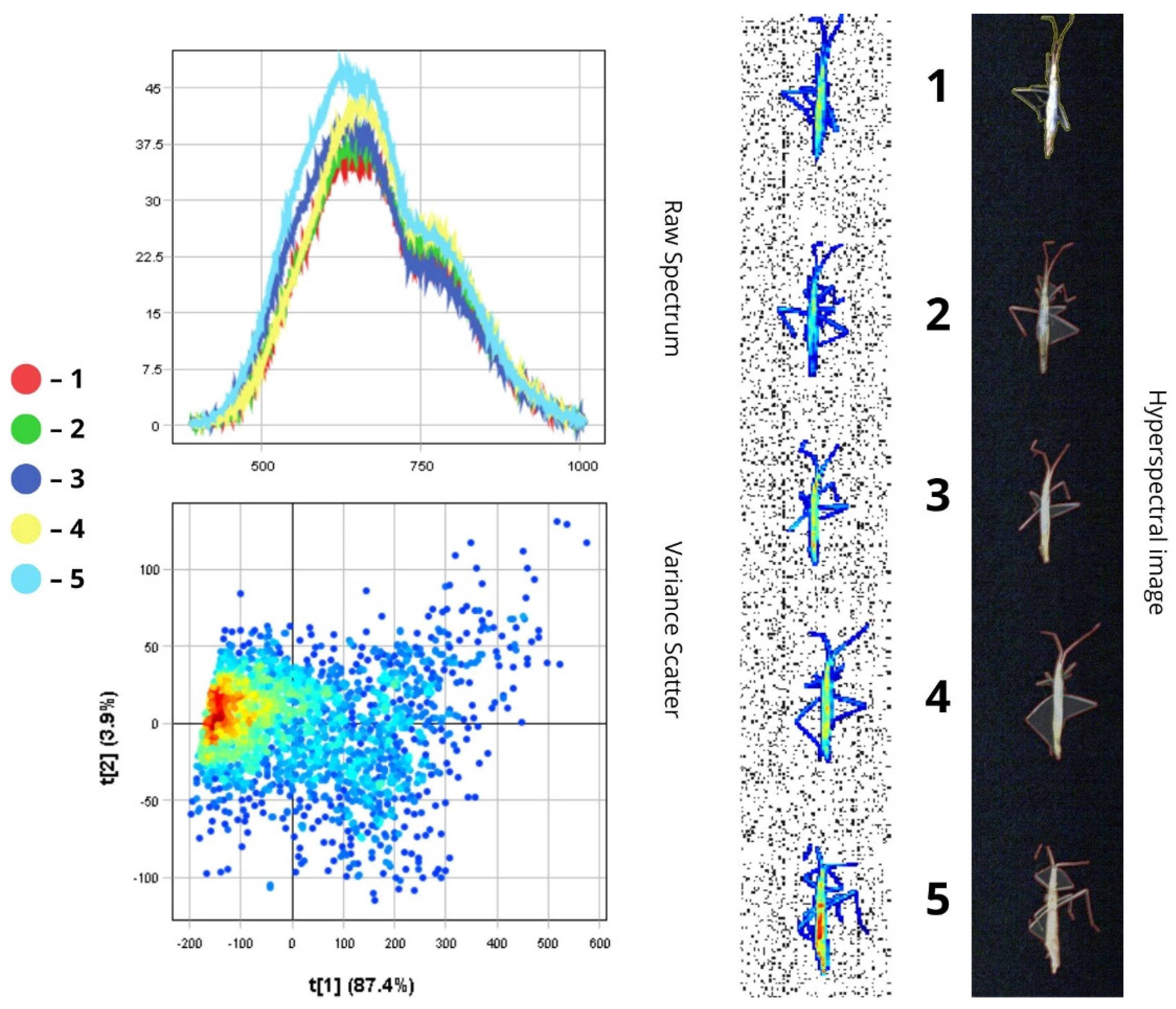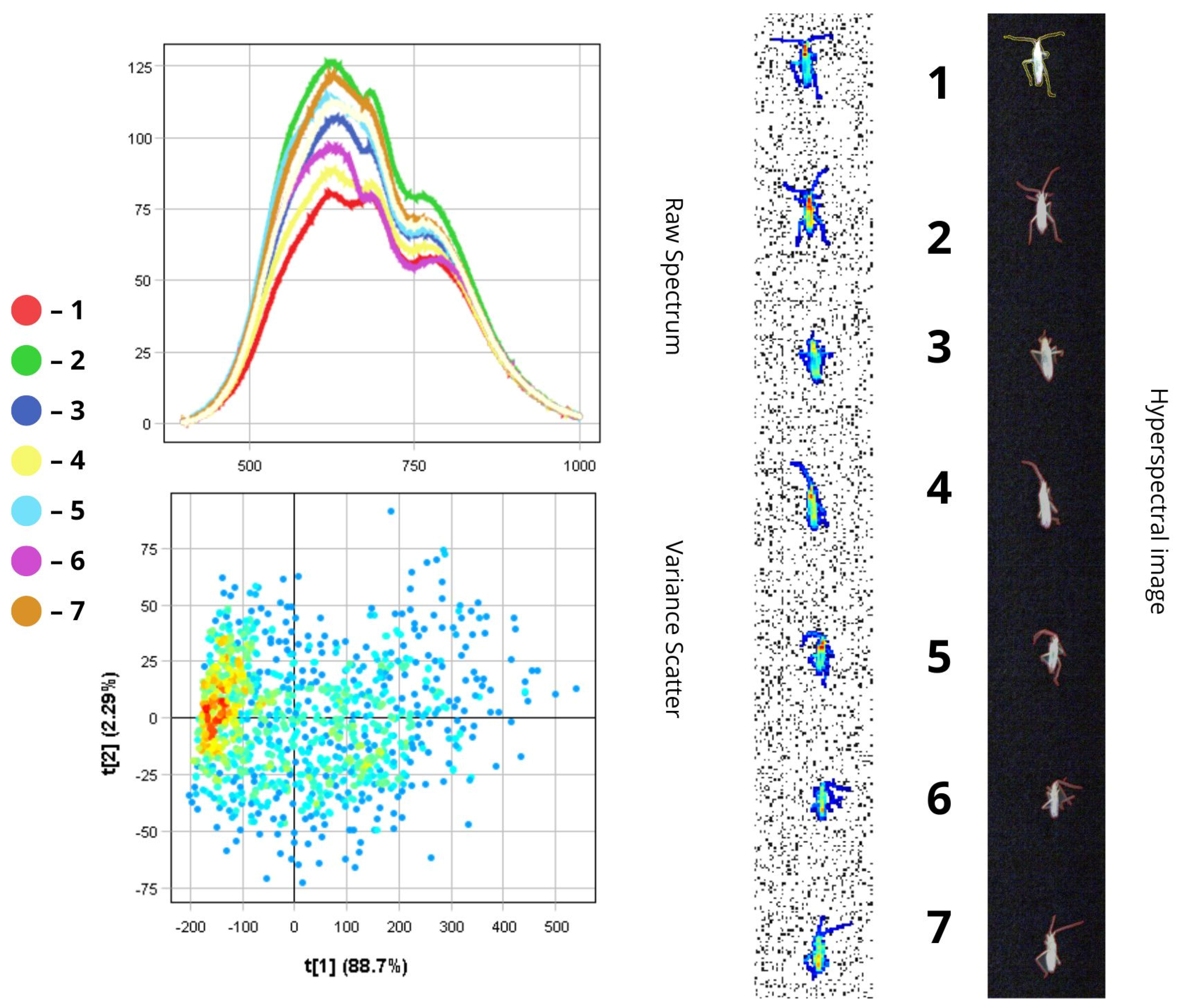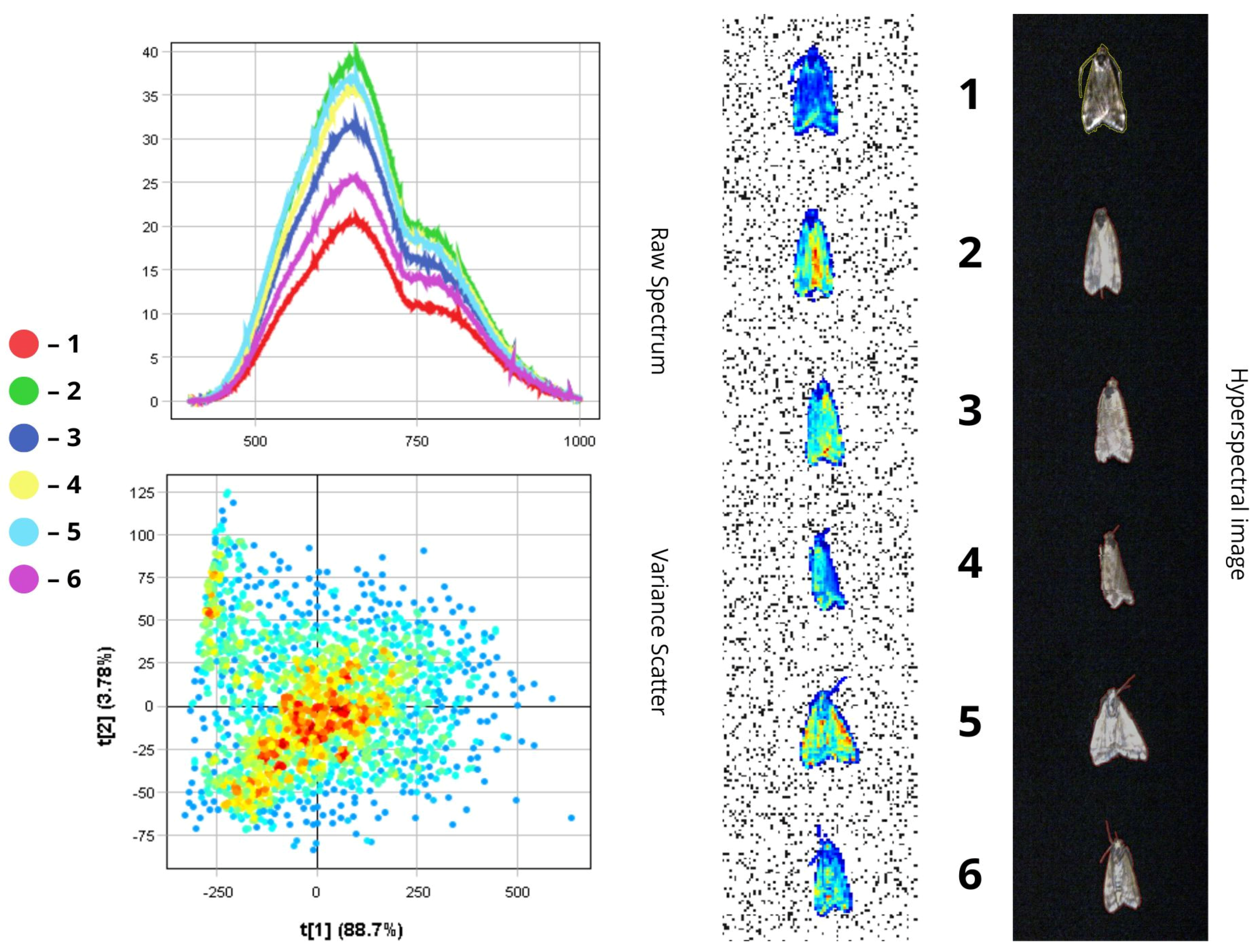To analyse the spectral characteristics of insect samples, we used the Pixel Explore tool. This tool allows us to interactively select areas directly on the hyperspectral image by using a PCA variance scatter plot. After selecting a region, the sample is added to the training dataset and labelled accordingly. The visualisation interface includes three main parts: Raw Spectrum—shows light reflectance across different wavelengths (up to 1000 nm) for each insect sample; Variance Scatter plot—displays how individual pixels are distributed along two principal components (t[1] and t[2]) that capture the main spectral differences; Max Variance image—highlights the image area with the most spectral variation. In the scatter plot, each dot represents a single pixel from the image. Dots that are close together indicate similar spectral properties. The colour of the dots reflects pixel density—red means more pixels with similar characteristics. The first principal component (t[1]) captures the most noticeable differences between spectra and is useful for grouping insects with similar spectral traits. The second component (t[2]) picks up on variations in surface texture and fine morphological features. The Max Variance image, automatically generated by the Breeze software (version 2024.2.0), is essentially a snapshot of the hyperspectral data at the wavelength where the differences between samples are most distinct. This helps to identify quickly the most informative regions for further analysis.
