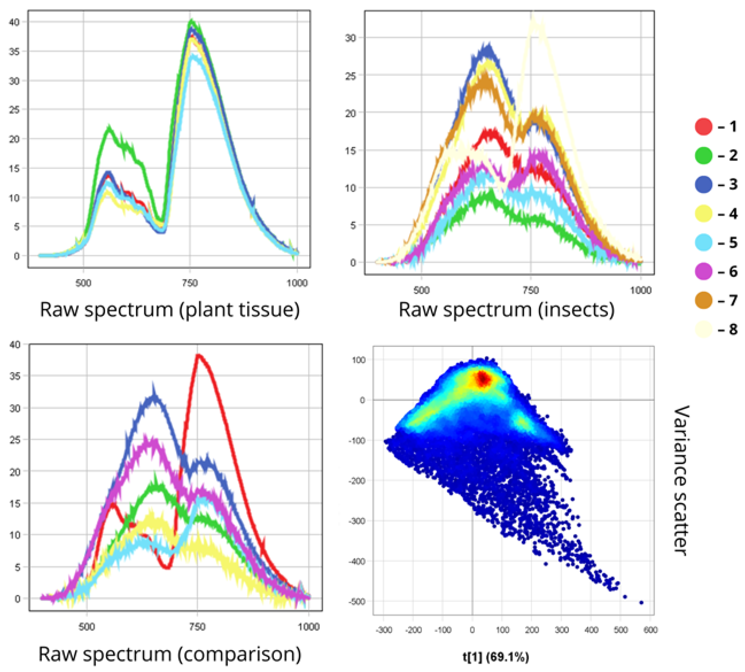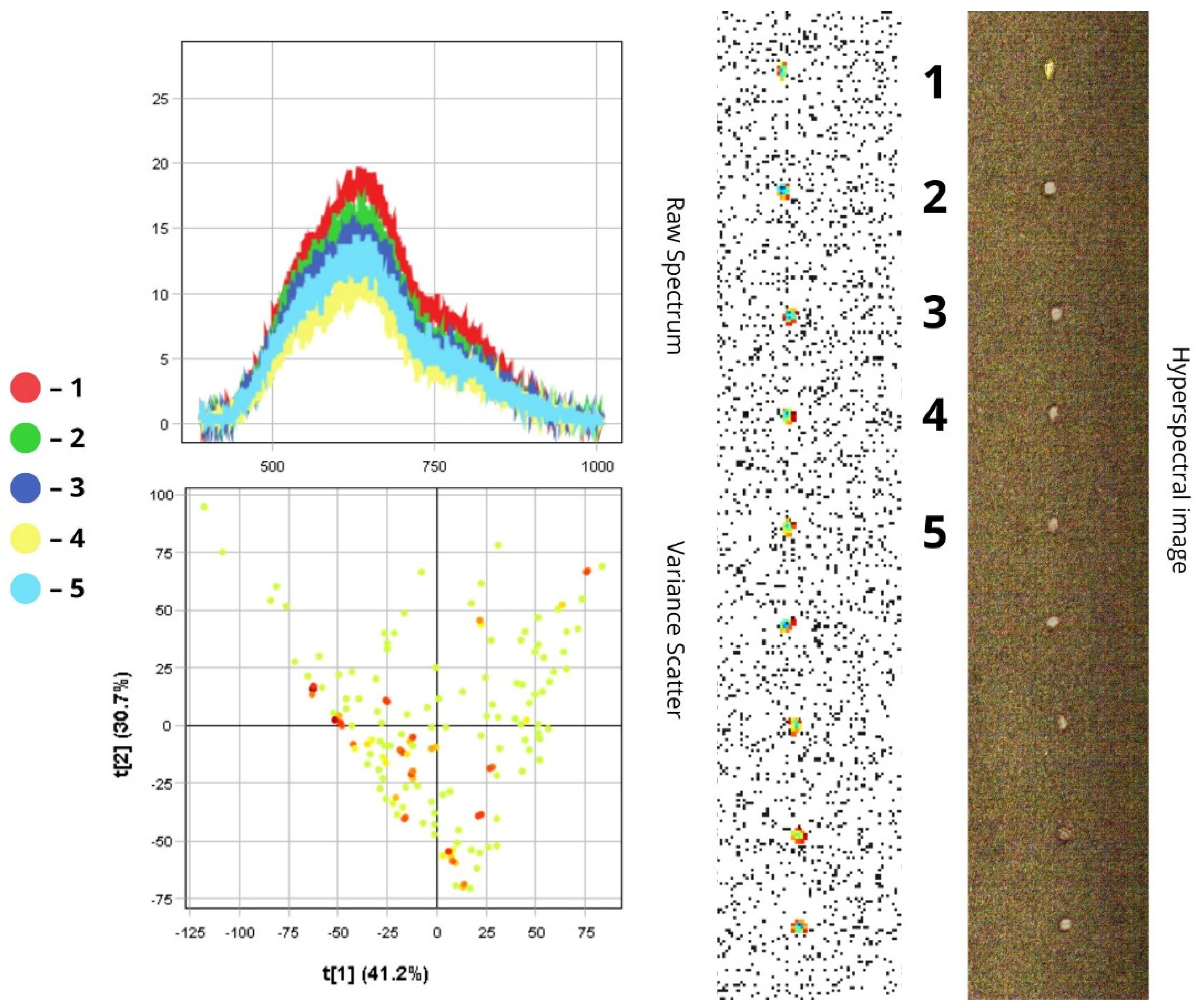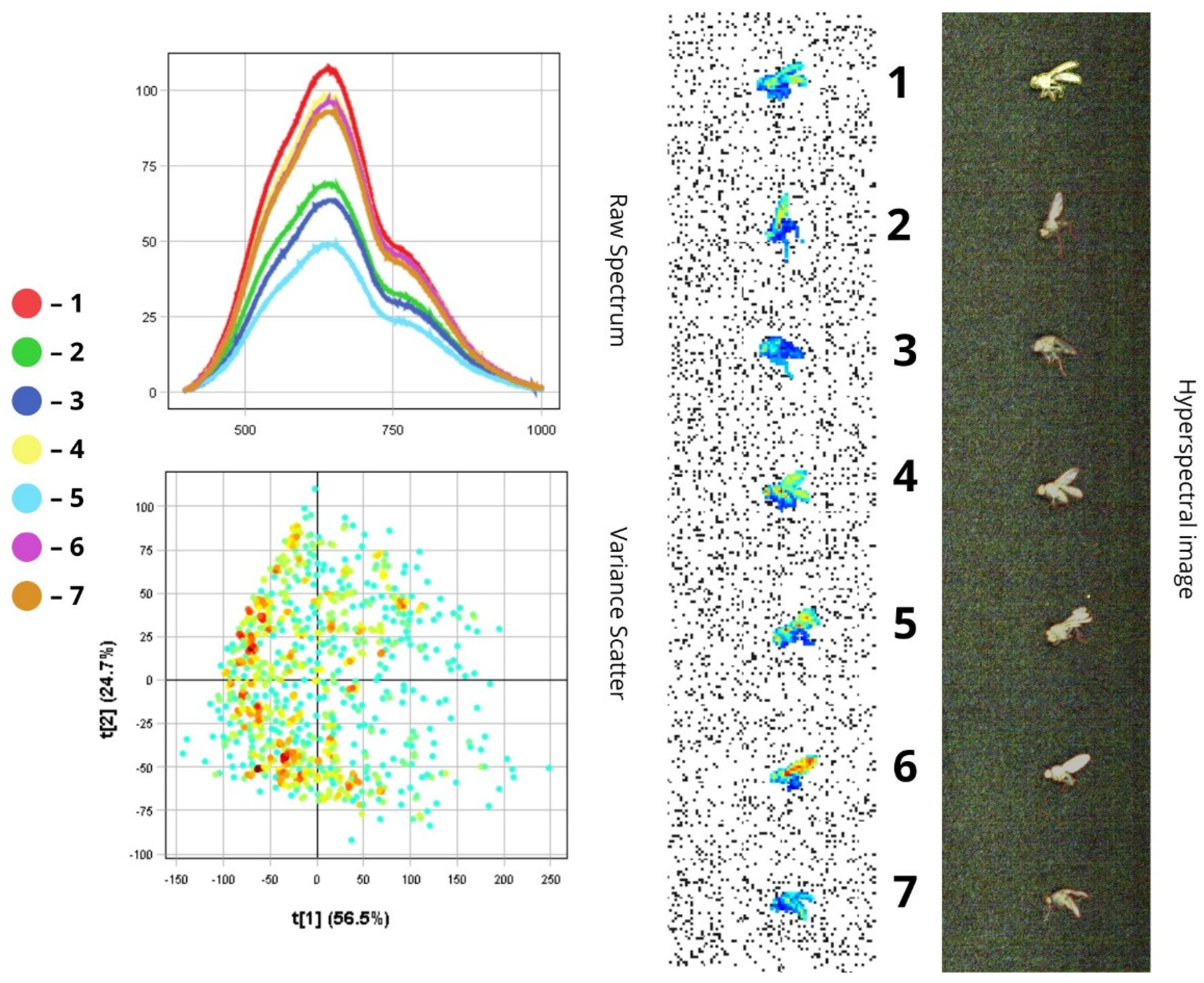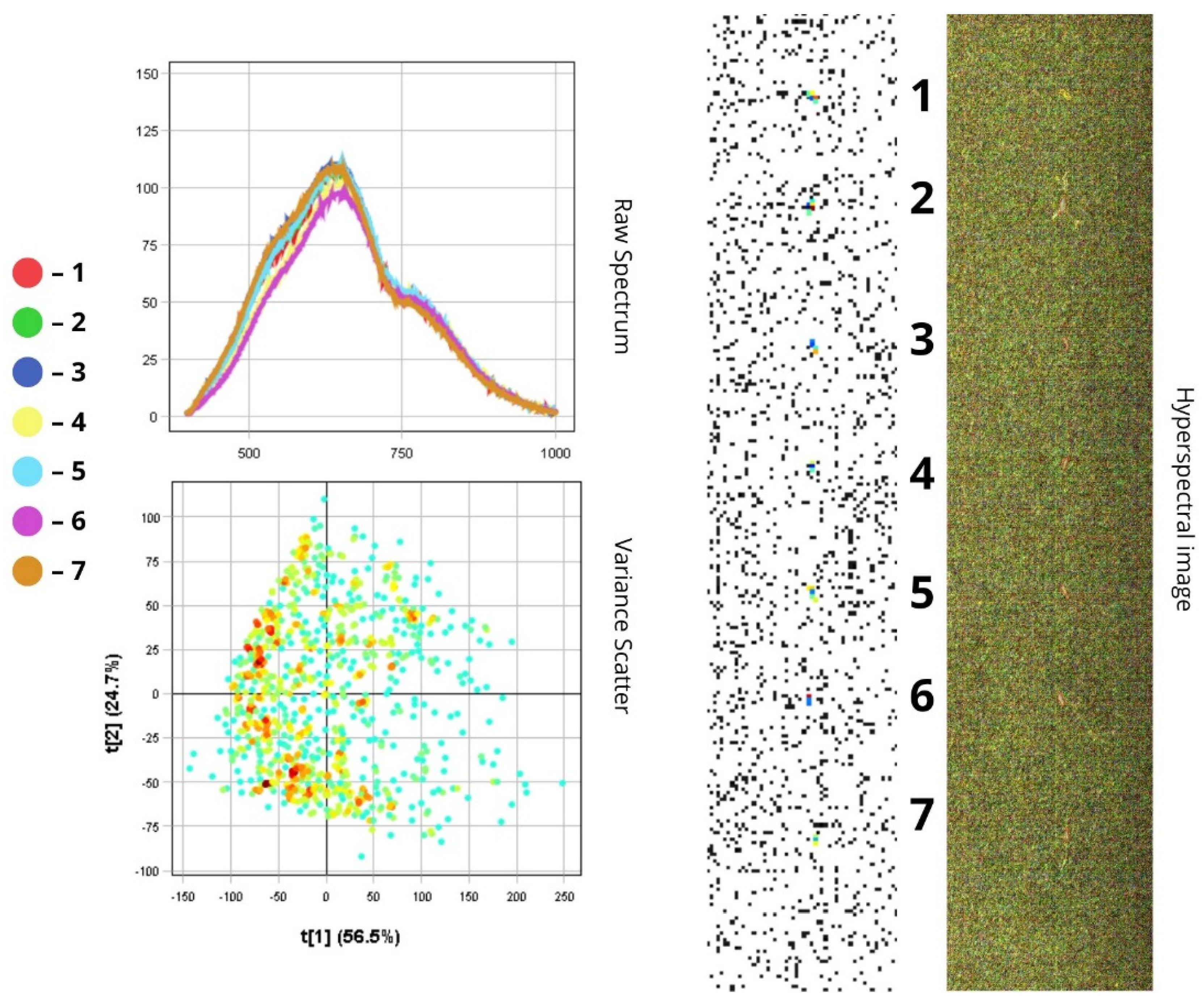 To analyse the spectral characteristics of insect samples, we used the Pixel Explore tool. This tool allows us to interactively select areas directly on the hyperspectral image by using a PCA variance scatter plot. After selecting a region, the sample is added to the training dataset and labelled accordingly. The visualisation interface includes three main parts: Raw Spectrum—shows light reflectance across different wavelengths (up to 1000 nm) for each insect sample; Variance Scatter plot—displays how individual pixels are distributed along two principal components (t[1] and t[2]) that capture the main spectral differences; Max Variance image—highlights the image area with the most spectral variation. In the scatter plot, each dot represents a single pixel from the image. Dots that are close together indicate similar spectral properties. The colour of the dots reflects pixel density—red means more pixels with similar characteristics. The first principal component (t[1]) captures the most noticeable differences between spectra and is useful for grouping insects with similar spectral traits. The second component (t[2]) picks up on variations in surface texture and fine morphological features. The Max Variance image, automatically generated by the Breeze software (version 2024.2.0), is essentially a snapshot of the hyperspectral data at the wavelength where the differences between samples are most distinct. This helps to identify quickly the most informative regions for further analysis.