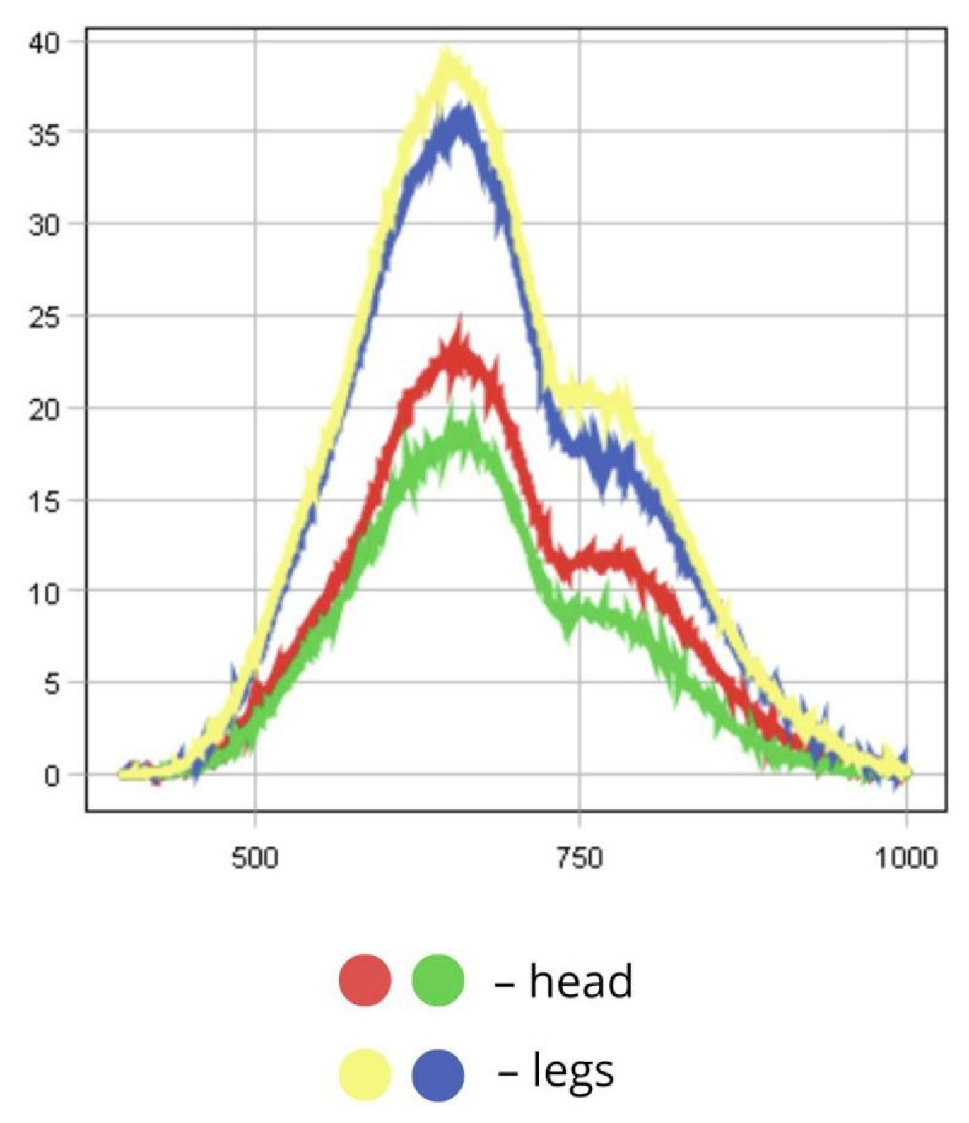 Hyperspectral imaging was performed using a FigSpec FS-13 VNIR scanning camera (400–1000 nm) (Hangzhou, China) employing a linear push-broom scanning method. The system uses a transmission diffraction grating as its spectral dispersive element and is capable of recording up to 1200 spectral bands with a spectral resolution of 2.5 nm. Illumination was provided by two LED light sources with a colour temperature of 5500 K and a colour rendering index (CRI) > 95, creating uniform irradiance of approximately 800 lux on the sample surface. The light incidence angle was 45°, preventing glare and ensuring stable reflectance measurements. Before each series of scans, radiometric calibration was performed using a Spectralon reference plate (99%) (Labsphere, Inc., North Sutton, NH, USA). The distance from the lens to the sample was 25 cm, corresponding to a spatial resolution of 0.3 mm/pixel. The spatial resolution of the sensor is 1920 pixels per line, with a pixel size of 5.86 µm—an essential parameter for capturing fine morphological details of small insects. The camera is equipped with a CMOS detector, which ensures high sensitivity and low noise levels, both critical for reliable spectral analysis. Image acquisition was carried out at a frame rate of 128 frames per second in full spectral mode, allowing continuous data collection across the entire VNIR range (400–1000 nm). This enabled a comprehensive analysis of reflectance and absorption characteristics of various insect morphological structures [53].