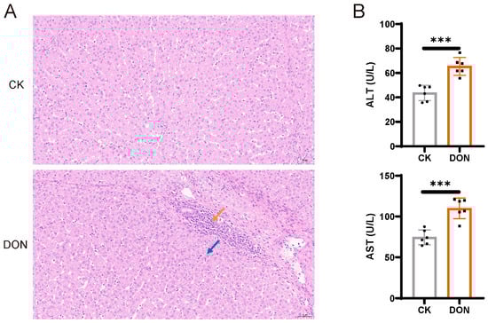 DON causes liver injury in piglets. (A). Representative histology of pig livers’ H&E staining. The blue arrows indicate cellular edema, and the orange arrows indicate lymphocyte infiltration. Scale bars: 100 µm. (B). ELISA measurement of ALT and AST in pig livers (n = 6). *** indicated p < 0.01.