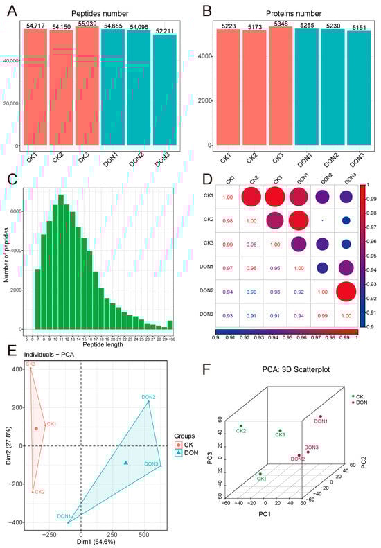 Proteomics analysis of porcine liver after DON treatment. (A,B) represent number of peptides and proteins detected in the two groups. (C). The peptide length profile shows the distribution of all identified peptide lengths. The abscissa represents the peptide length, and the ordinate represents the number of peptides detected. (D). Correlation analysis among different samples and groups. The size and clour represent the value of correlation. (E,F). Score plot of principal component analysis (PCA) of proteomics data from control and DON-treated livers in 2D and 3D.