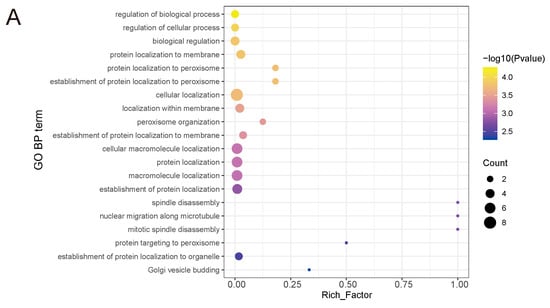 To further investigate the functions of the DEPs, separate in-depth functional enrichment analyses were performed on the upregulated and downregulated DEPs. The results showed that upregulated and downregulated proteins were involved in different functions and pathways. KEGG enrichment results showed that upregulated proteins were mainly involved in cysteine metabolism, caffeine metabolism, and related metabolic pathways, while downregulated proteins were primarily involved in ribosome and RNA degradation-related pathways (Figure 5A,B). GO enrichment analysis showed that in BP terms, upregulated proteins were mainly involved in nuclear migration, L-serine biosynthesis, and nuclear localization functions, while downregulated proteins were mainly involved in protein localization and peroxisome-related functions (Figure S2A,B).