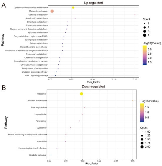 Functional enrichment of up- and down-regulated DEPs. (A,B) represent KEGG enrichment of up- and down-regulated DEPs. The size of the dots represents the number of proteins, and the color represents the significance of the pathway. The x-axis indicates the enrichment factor, and the y-axis represents different functional terms.