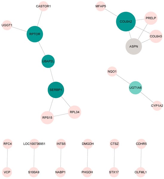 A PPI network interaction map was constructed using the STRING database (STRING 12.5) and Cytoscape software (Cytoscape 3.10.4). The results showed that the DEPs were divided into different clusters of interacting proteins (Figure 6). Some proteins had certain interaction relationships, such as RPS15, RPL34, SERBP1, UBAP2L, RPTOR, UGGT1, and CASTOR1. Some proteins also had pairwise interactions, such as PHGDH and DMGDH.