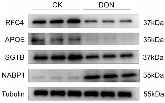To verify the expression of the key proteins discovered by proteomics sequencing in the liver under DON exposure, we selected the key proteins from the sequencing results for experimental verification by Western Blot (WB) experiments to validate the accuracy of the proteomic results. The results showed that after DON treatment, the expression levels of RFC4,SGTB and APOE proteins in liver samples were significantly decreased, while the expression level of NABP1 protein was significantly increased (Figure 7), indicating the accuracy of the proteomic results.