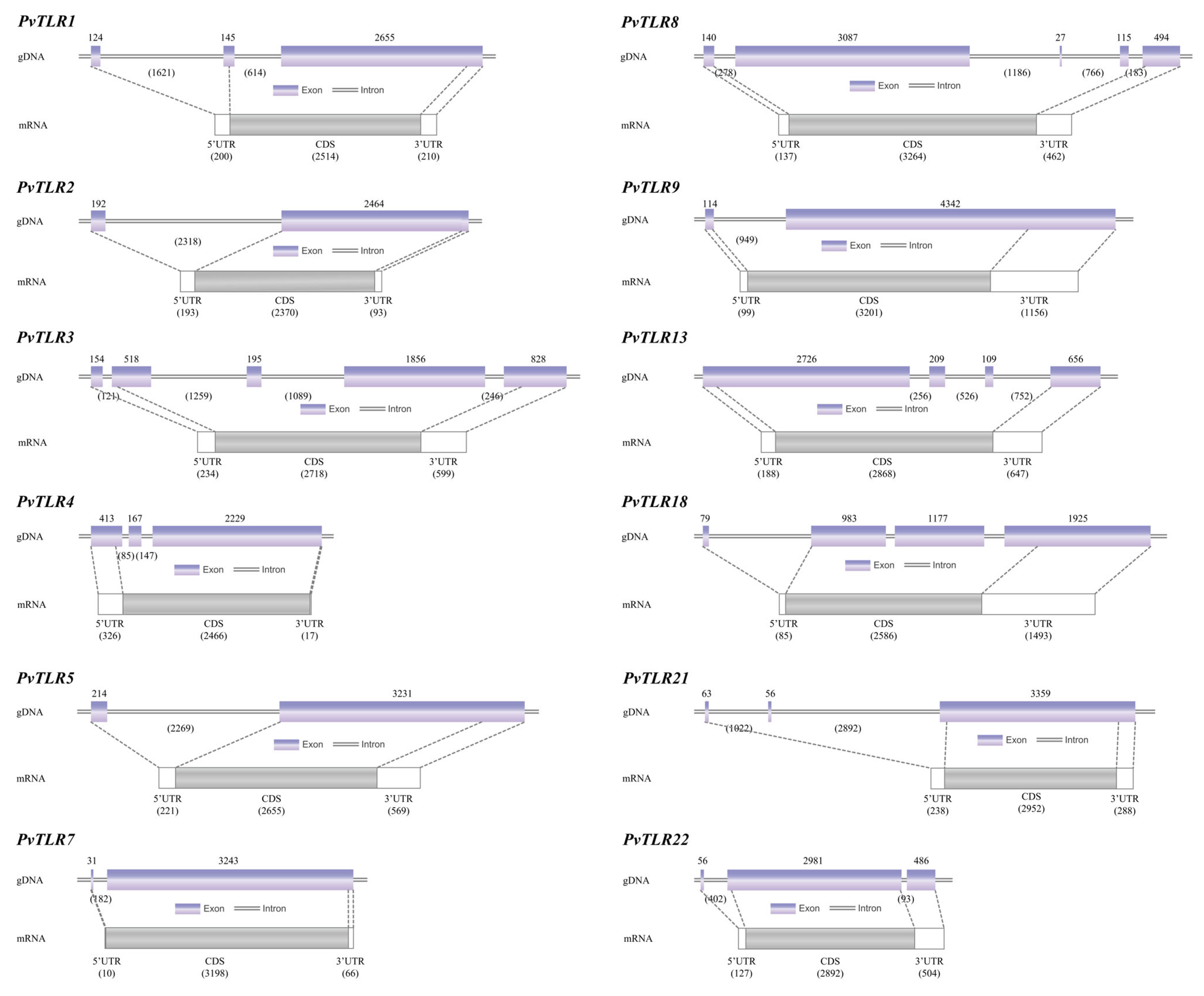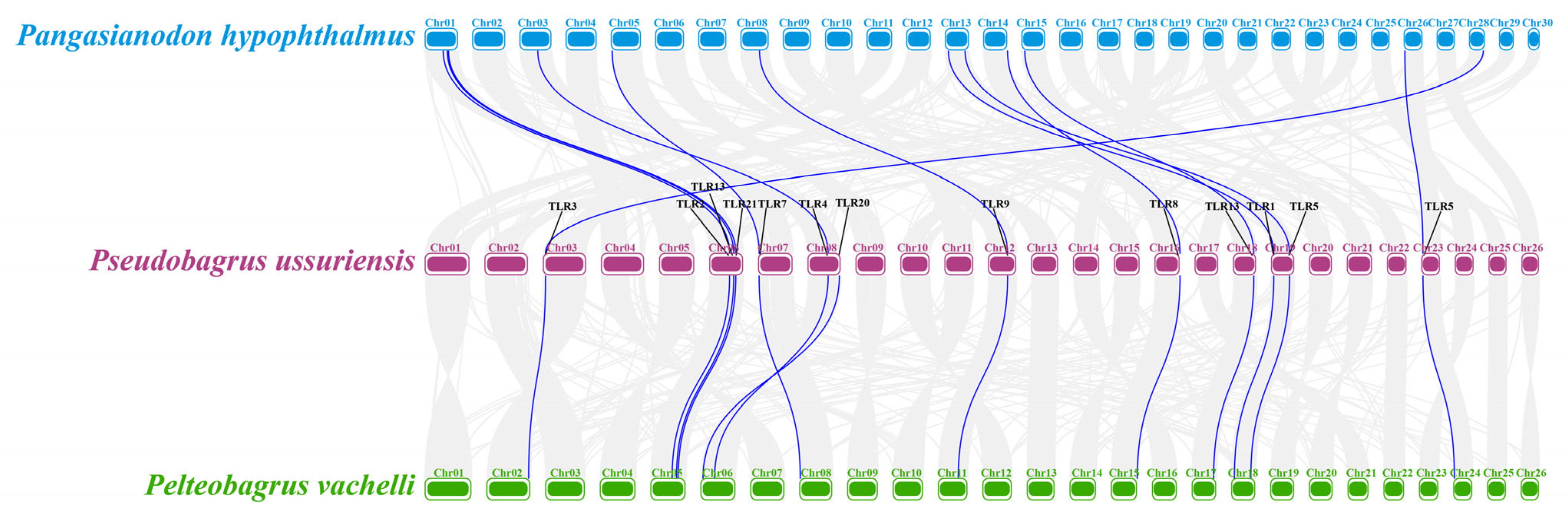3.3. Gene Structures of TLRs in P. vachelli