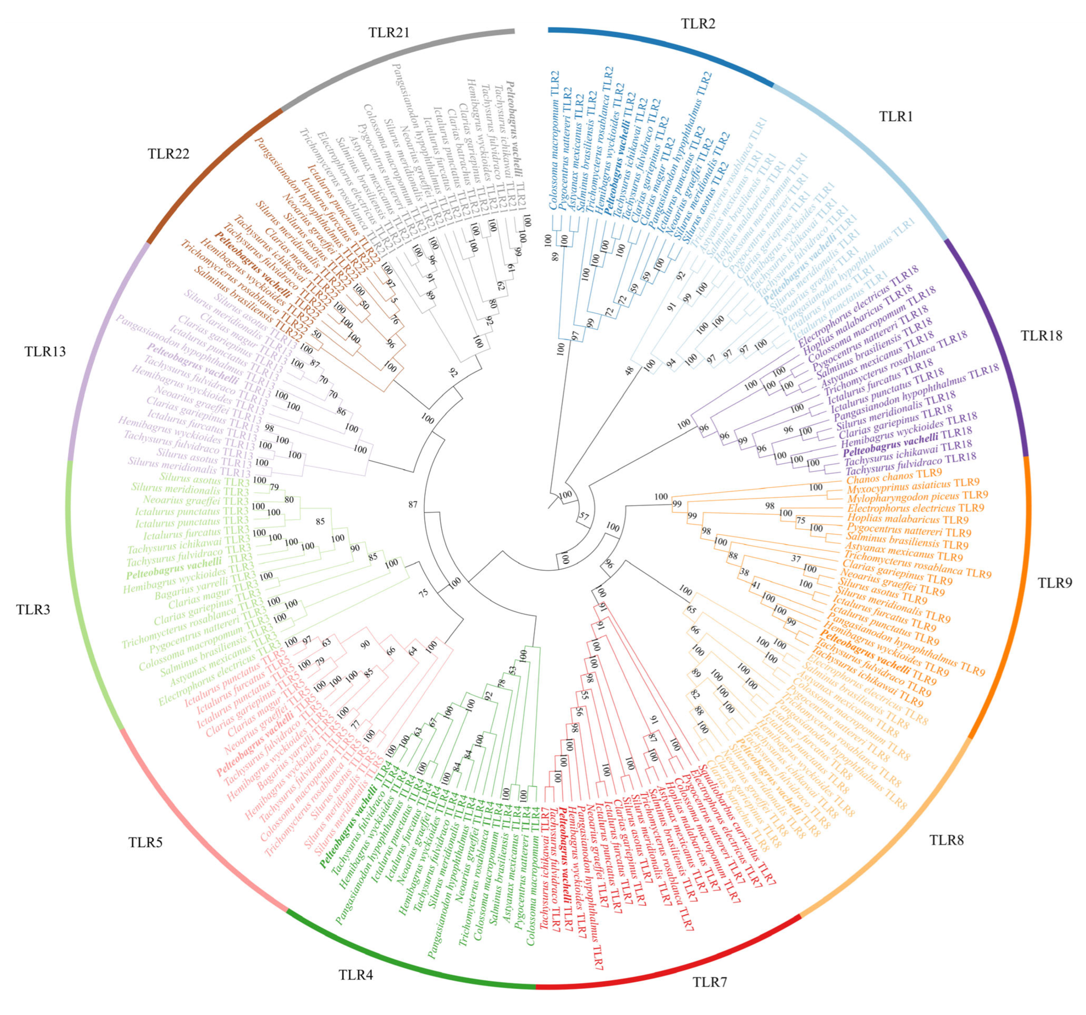- Qin, C.; Gong, Q.; Wen, Z.; Yuan, D.; Shao, T.; Li, H. Molecular characterization and expression of toll-like receptor 5 genes from Pelteobagrus vachellii. Fish Shellfish Immunol. 2018, 75, 198–207. [Google Scholar] [CrossRef]