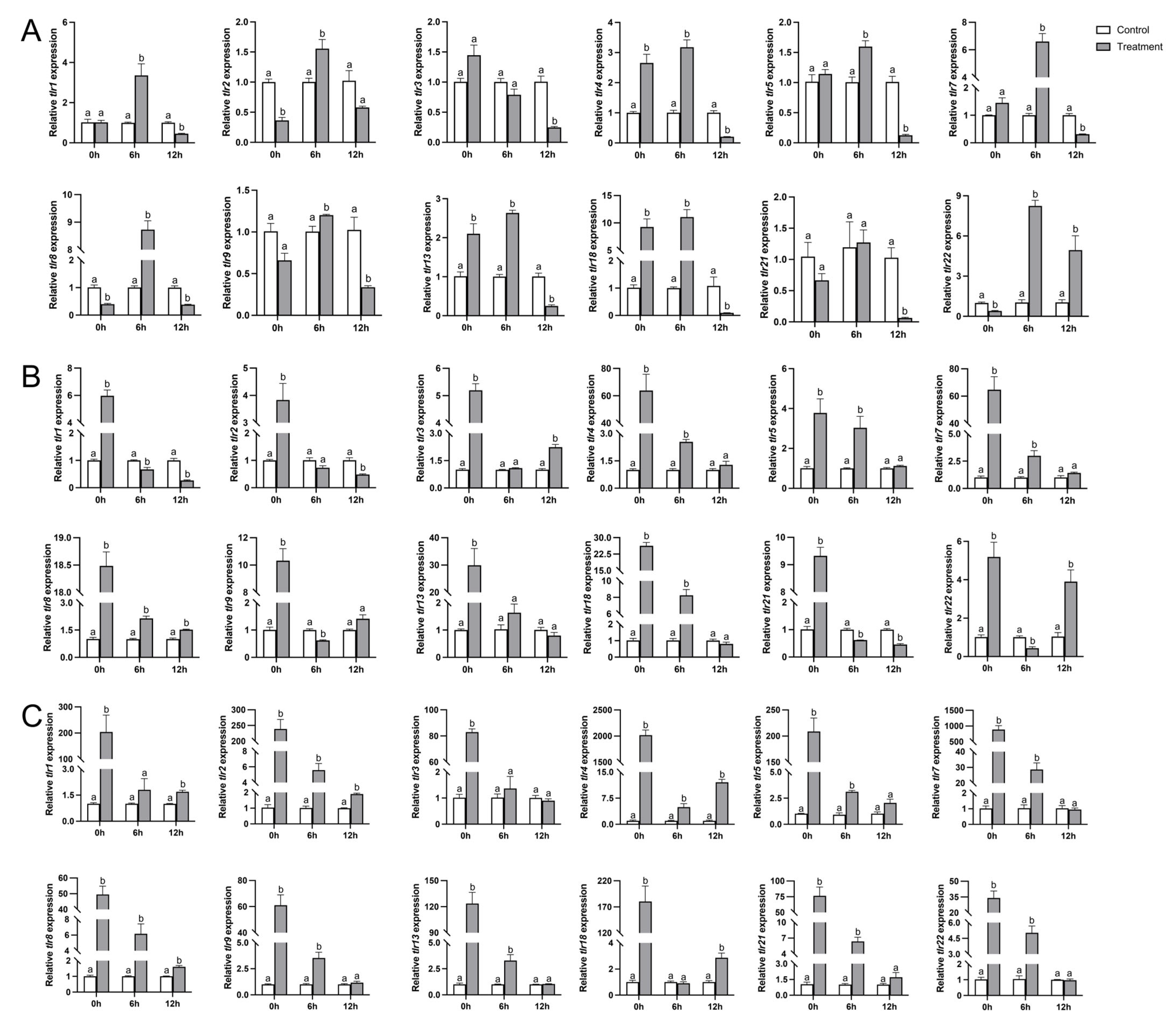 - Wang, K.; Chen, D.; Lin, S.; Li, S.; Deng, B.; Chen, W.; Zhan, H.; Deng, Z.; Li, Q.; Han, C. Molecular characterization and expression analysis of four toll-like receptors (TLR) genes: TLR2, TLR5S, TLR14 and TLR22 in Mastacembelus armatus under Aeromonas veronii infection. Dev. Comp. Immunol. 2025, 165, 105345. [Google Scholar] [CrossRef]