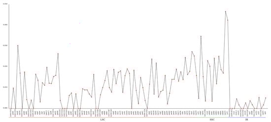 The average nucleotide diversity (Pi) of the chloroplast genome was calculated to be 0.01058. Notably, there were 37 regions exhibiting significantly higher Pi values (>0.01537). Among these, the rps15 gene region demonstrated the highest variability, with a Pi value of 0.04656, located within the SSC region (Figure 5).