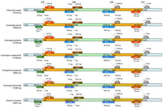 The expansion and contraction of inverted repeat (IR) regions at junction sites were investigated across seven Sapindaceae chloroplast genomes, specifically those of H. davidii (MT861130.1), Hydrangea petiolaris (NC_034935.1), Hydrangea moellendorffii (NC_044805.1), Kirengeshoma palmata (NC_044808.1), Hydrangea paniculata (NC_044829.1), and Deutzia compacta (NC_044843.1). These IR junction dynamics were examined and visualized using the IRscope online tool (https://irscope.shinyapps.io/irapp/ (accessed on 30 December 2023) [29].