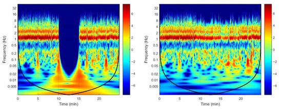 Time–frequency representation of the photoplethysmography (PPG) signal obtained by continuous wavelet transform in the occluded (left panel) and contralateral (right panel) arms of a representative subject (male, 22 years). Power values (color scale, log-normalized) reflect the relative contribution of oscillatory components over time. The black curve marks the cone of influence, outside which edge effects become significant. Downward frequency cascades can be observed at approximately 10 min (cuff inflation) and 15 min (cuff deflation).