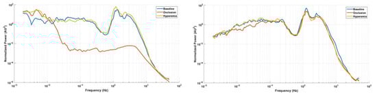 Median (N = 12) wavelet frequency spectra of PPG signals recorded from the test and contralateral limbs. The wavelet power at each frequency was normalized by the total signal variance. Log–log scaling highlights the redistribution of power across physiological frequency bands during the vascular response to ischemia and reperfusion.