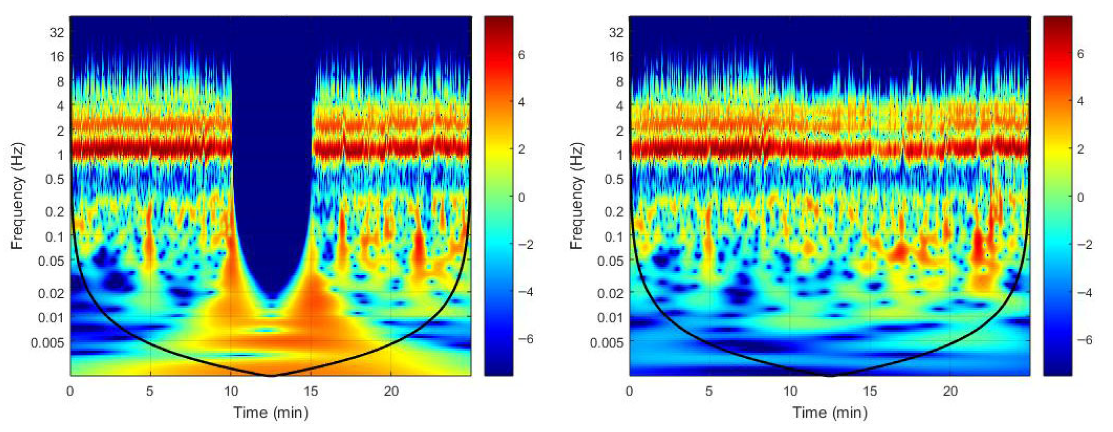 In this study, spectral activity was assessed using the area under the time-averaged wavelet power spectrum rather than amplitude-based metrics. This choice provides an integrated estimate of the total oscillatory energy within each physiological frequency band, reflecting both the strength and persistence of activity during each phase. Compared with amplitude or AUC-of-amplitude approaches, power integration offers greater robustness to transient fluctuations and noise, while preserving the physical relationship between signal variance and energy. Expressing spectral activity in energy terms ensures methodological consistency with conventional Fourier power spectral analysis, facilitating comparison across studies and enhancing the physiological interpretability of the results [13].