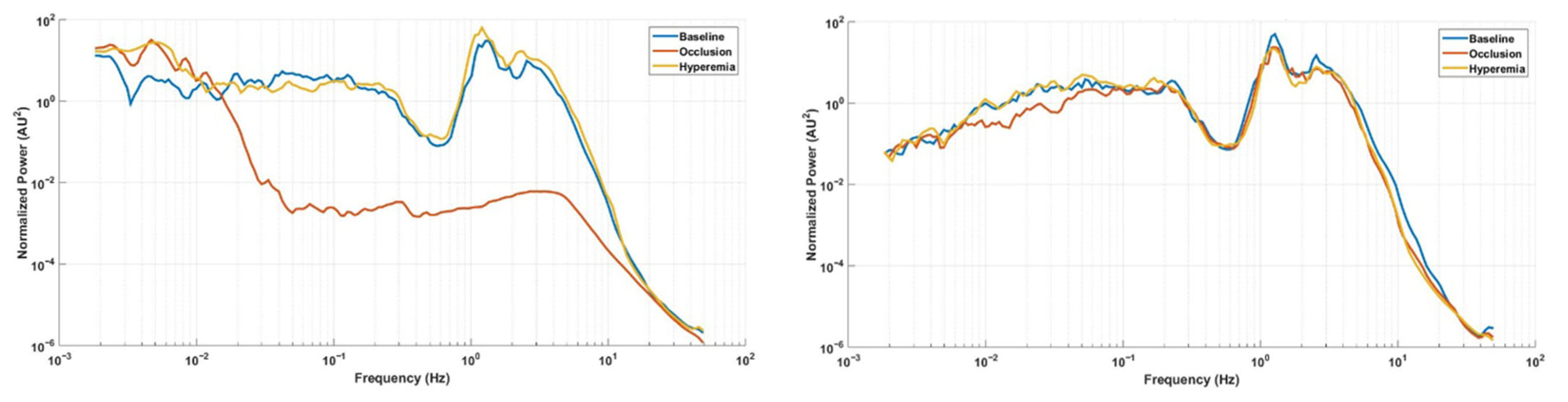 Table 2 and Table 3 present the median (IQR) values of skin blood flow (AU), spectral power and percent contribution for all frequency components in the test (occluded) and contralateral limbs. Figure 1 shows the redistribution of time–frequency energy across the three phases, and Figure 2 provides the corresponding median wavelet spectra for both limbs, highlighting the suppression of high-frequency components during occlusion and the rebound of slow endothelial oscillations during hyperemia.