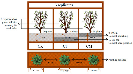 The field was planted with E. sessiliflorus seedlings in October 2022, and a randomized block design was used with three treatments and three replicates, each plot measuring 30 m2 (6 m × 5 m), with 20 Eleutherococcus sessiliflorus plants planted per plot. For plant assessment, five representative plants were randomly selected from each plot for growth evaluation. The treatments included the following: CK (no amendment, control), CI (corncob incorporation at a 20 cm depth), and CM (corncob mulching, lightly mixed into the 0–10 cm surface layer). The corncob biomass used in the study was sourced from Zea mays (cv. Jingqing 707) residues collected from Fuyu, Jilin Province. The corncobs were air-dried, crushed to ≤5 mm, and applied at a rate of 2.5 t C/ha, equivalent to 16.7 kg per plot. A polyethylene (PE) film root barrier (50 cm wide) was installed between plots to minimize belowground interference. Field management followed local agronomic practices without the use of chemical fertilizers (Figure 1). This study did not include co-cultivation experiments with Fabaceae species. Although leguminous plants are known for their nitrogen-fixing ability, which could potentially enhance nutrient availability and amplify the effects of corncob amendment, the primary aim of this study was to evaluate the effects of corncob return on the growth of E. sessiliflorus alone. Future studies could consider co-cultivation with leguminous species to further assess the impact of corncob return on nutrient supply and growth across different plant types.