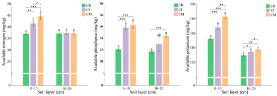 Effects of corncob returning on soil available nitrogen (AN), available phosphorus (AP), and available potassium (AK) in E. sessiliflorus rhizosphere at 0–10 cm and 10–20 cm soil depths. Significance levels: * p < 0.05, ** p < 0.01, *** p < 0.001. Different lowercase letters indicate significant differences among the CK, CI, and CM treatments at the same soil depth (p < 0.05), as determined by one-way analysis of variance (ANOVA) followed by Tukey’s honestly significant difference (HSD) post hoc test.