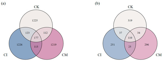 Residue returning notably altered soil microbial richness, as shown by the Venn diagrams of bacterial and fungal OTUs (Figure 3). The bacterial community displayed the greatest richness under CI (1226 unique OTUs), followed by CM (1219), while CK harbored comparatively fewer unique taxa (1225). Moreover, the shared OTU number among all treatments (177) suggests the presence of a core bacterial consortium associated with E. sessiliflorus rhizosphere, regardless of residue management. The increase in unique bacterial OTUs under residue treatments indicates that corncob returning introduced new ecological niches and substrate heterogeneity, stimulating colonization by diverse taxa [33]. Lignocellulosic residues supply complex carbon sources that foster copiotrophic bacteria and support metabolic diversification [34], explaining the enrichment of distinct bacterial pools under CI and CM. The slightly higher richness under CI implies that incorporation enhances substrate–microbe contact, accelerating residue turnover and stimulating bacterial proliferation [35].
