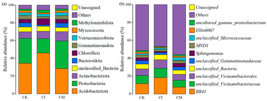 Compared with CK, both CI and CM treatments increased the abundance of Proteobacteria and Bacteroidota, while reducing Acidobacteriota (Figure 4a). Proteobacteria are typically considered copiotrophic groups stimulated by readily available nutrients and labile carbon sources [39], suggesting that corncob returning enhanced nutrient supply and created resource-rich microhabitats. Bacteroidota are known decomposers of complex polysaccharides, particularly hemicellulose [40], implying active involvement in lignocellulose degradation following corncob addition. In contrast, the decline in Acidobacteriota—which generally thrives in low-nutrient or acidic environments—indicates a shift toward more nutrient-favorable microbial niches [41]. Additionally, increases in Gemmatimonadota and Chloroflexi under mulching suggest enhanced soil moisture and carbon turnover, as these groups benefit from carbon mineralization processes and improved microaerobic conditions [42]. Overall, CM demonstrated a more pronounced shift in phylum-level composition than CI, reflecting stronger stimulation of copiotrophic and residue-degrading taxa.