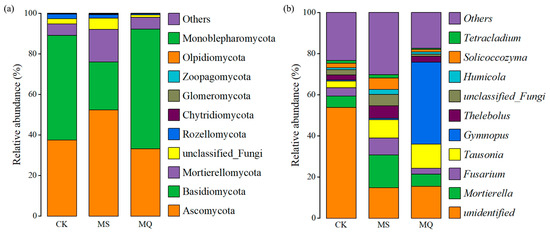 Relative abundance of major fungal taxa at (a) phylum and (b) genus levels under different corncob returning treatments.