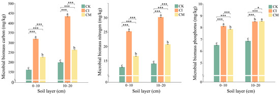 Effects of corncob returning on microbial biomass carbon (MBC), nitrogen (MBN), and phosphorus (MBP) in rhizosphere soil at 0–10 cm and 10–20 cm depths. Different letters indicate significant differences among treatments at p < 0.05. Significance levels: * p < 0.05, *** p < 0.001. Different lowercase letters indicate significant differences among the CK, CI, and CM treatments at the same soil depth (p < 0.05), as determined by one-way analysis of variance (ANOVA) followed by Tukey’s honestly significant difference (HSD) post hoc test.