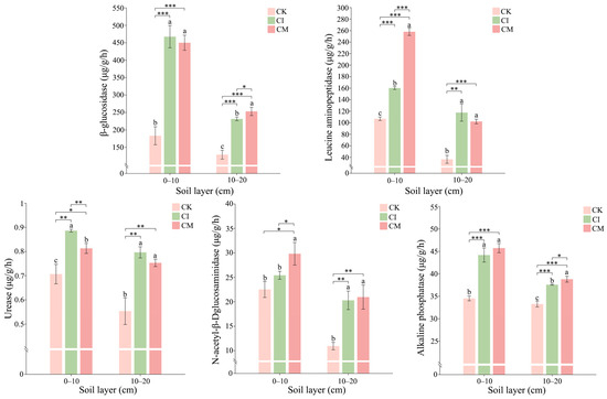 Effects of corncob returning on soil enzyme activities, including β-glucosidase, leucine aminopeptidase, N-acetyl-β-D-glucosaminidase, urease, and alkaline phosphatase, at 0–10 cm and 10–20 cm depths. Different letters indicate significant differences at p < 0.05. Significance: * p < 0.05, ** p < 0.01, *** p < 0.001. Different lowercase letters indicate significant differences among the CK, CI, and CM treatments at the same soil depth (p < 0.05), as determined by one-way analysis of variance (ANOVA) followed by Tukey’s honestly significant difference (HSD) post hoc test.