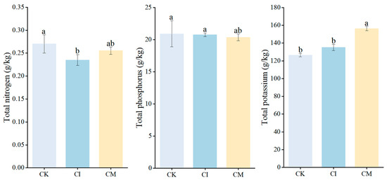 Effects of corncob returning on leaf nitrogen (N), phosphorus (P), and potassium (K) concentrations of E. sessiliflorus. Different letters indicate significant differences among treatments at p < 0.05.