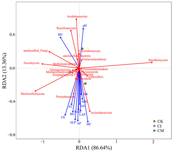 Redundancy analysis (RDA) of soil physicochemical properties, enzyme activities, and microbial community composition under different corncob returning treatments. BD, bulk density; pH, potential of hydrogen; EC, electrical conductivity; MC, moisture; SOC, soil organic carbon; UE, urease; BG, β-glucosidase; ALP, alkaline phosphatase; LAP, leucine aminopeptidase; NAG, N-acetyl-β-D-glucosaminidase; AP, available phosphorus; AN, available nitrogen; AK, available potassium. The red vectors represent the microbial community composition, while the blue vectors correspond to the soil physicochemical properties and enzyme activities.