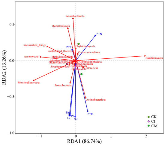 RDA of plant traits and microbial community composition following corncob returning. Ph, plant height; La, leaf area; Fn, fruit number; Sd, stem diameter; PTN, plant total nitrogen; PTP, plant total phosphorus; PTK, plant total potassium. The red vectors represent the microbial community composition, while the blue vectors represent the plant traits.